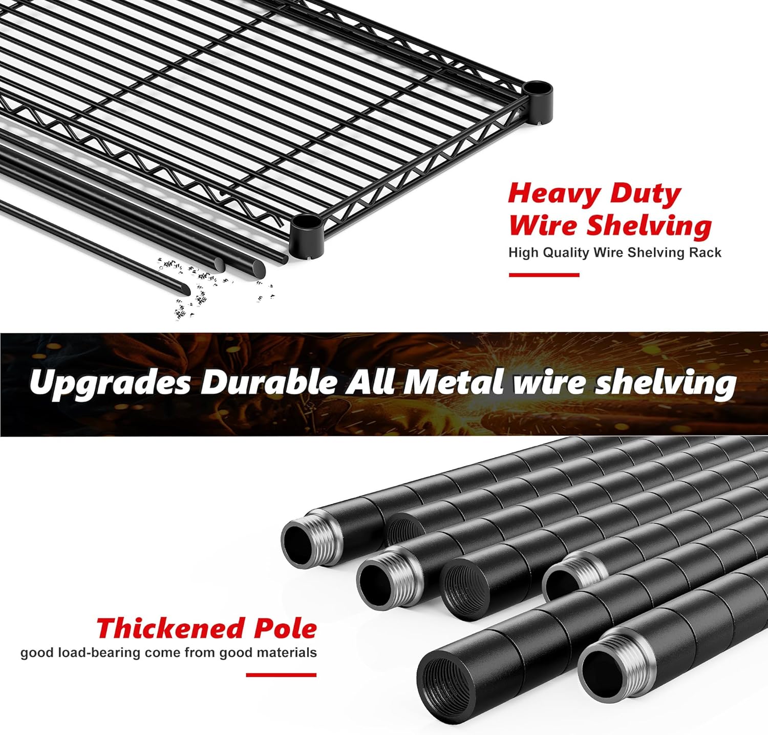 - γ1500 LBS Capacity Super Sturdy Storage ShelvesγThis Metal shelves for storage made of heavy duty steel wire,and has undergone special coating treatment. Every solid thickened industrial shelving with extra stiffener, can easily bear 300LBS a total of 1500 lbs bearing capacity. which means this metal shelving units and storage will always be your reliable partner.