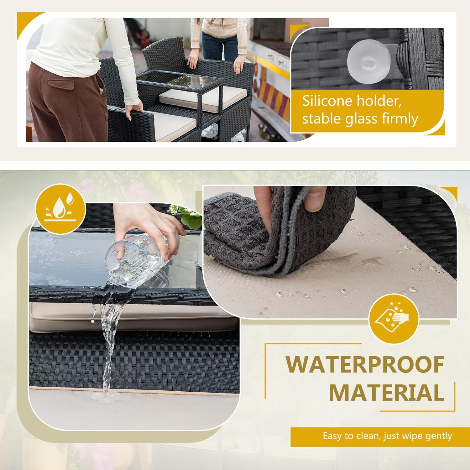 - Built-in Table & Storage: In the middle of the patio loveseat integrated storage compartment and small table, you can put some drinks, snacks, fruits within your reach in the tempered glass top. The small storage space below you can put books, tea cans and etc. This design saves your space and add more convenience.