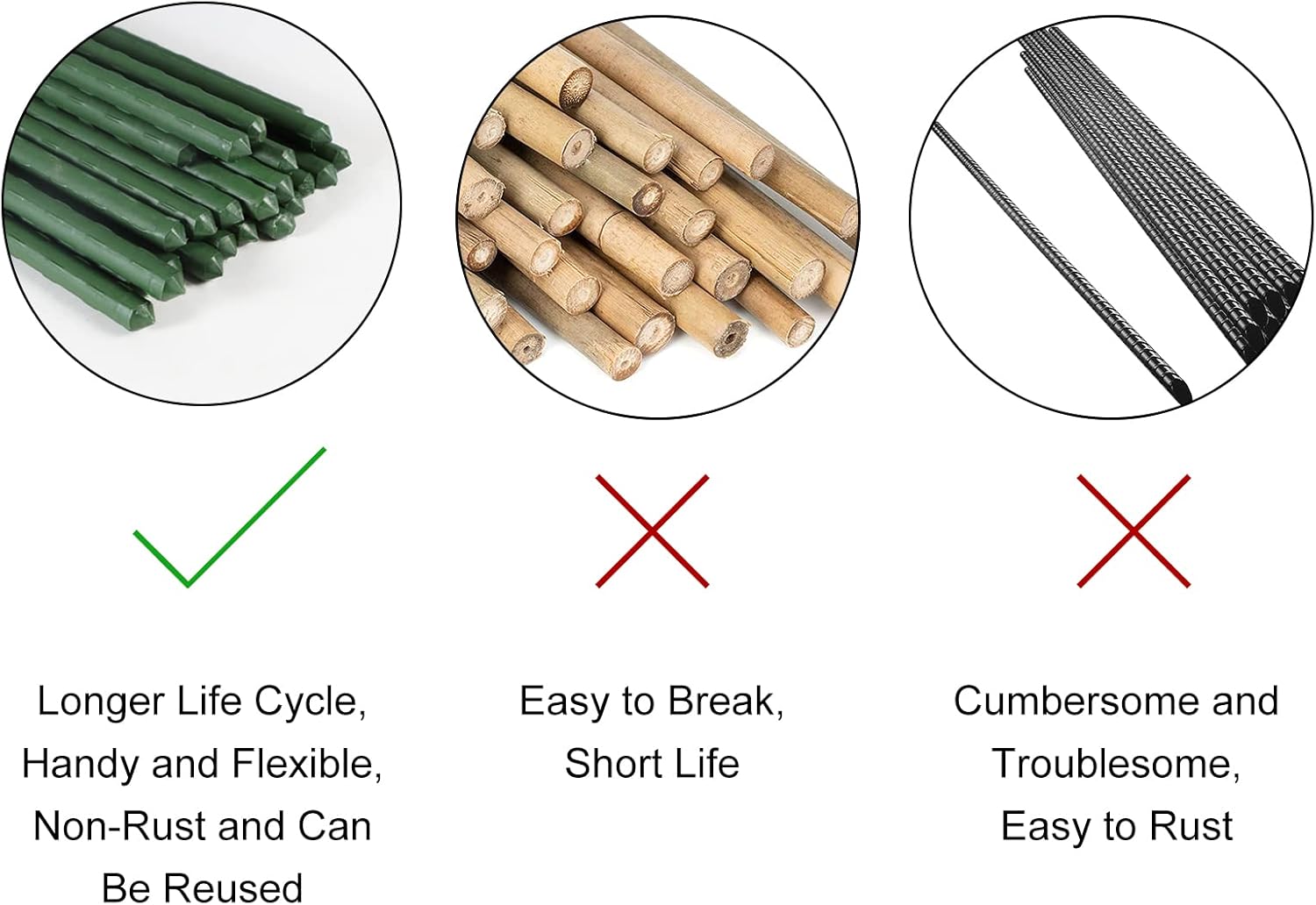 - Sturdy Garden Stakes: The garden stakes are made of sturdy hollow steel, and the surface is covered with a non-fading green plastic coating for weather and rust protection, have a longer life cycle than bamboo stakes and wood stakes, more handy and flexible than rebar and, can be reused.