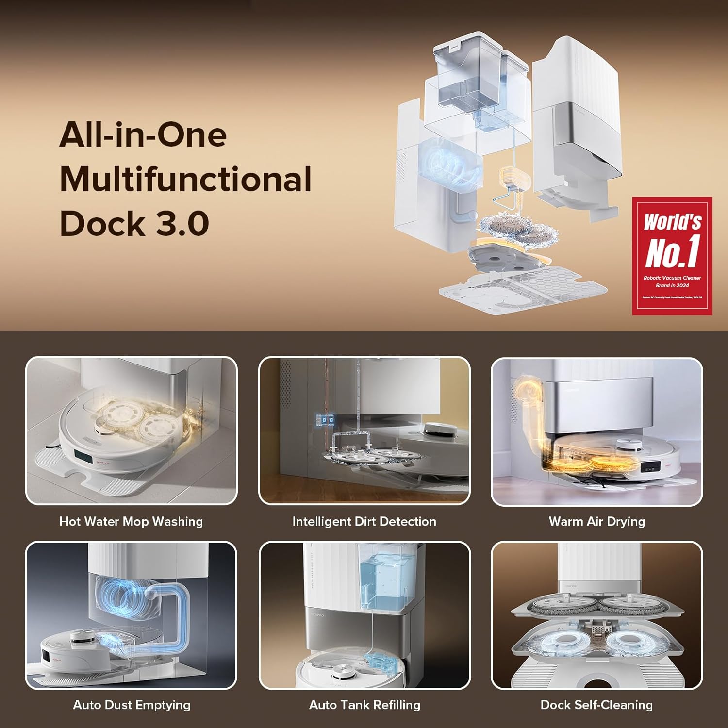 - Multifunctional Dock 3.0 - Upgrade to unmatched convenience with our advanced docking station. Intelligent Dirt Detection uses hot water for a thorough mop rinse and revisits heavily soiled areas for spotless floors. The hot water mop wash and 113Β°F warm air drying keep the mop fresh and ready. Enjoy 7+ weeks without emptying thanks to automatic dust collection and water replenishment. The dock's self-cleaning feature reduces maintenance, ensuring top performance. This revolutionary dock can offer you a truly hands-free cleaning experience, perfect for pet owners and families with kids.