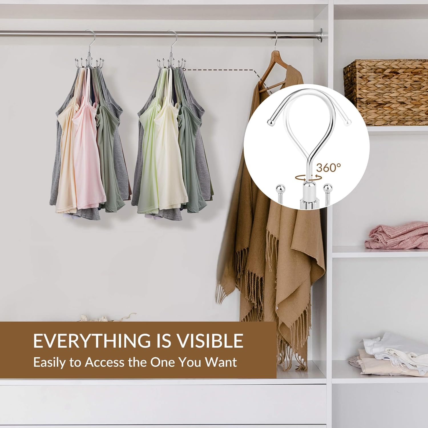 - 360Β° Rotatable Hooks: Each hanger in the set features a 360Β° rotating top hook, allowing for effortless access to all garments. Select any bra or tank top from any angle with ease, enhancing the convenience of your closet organization.