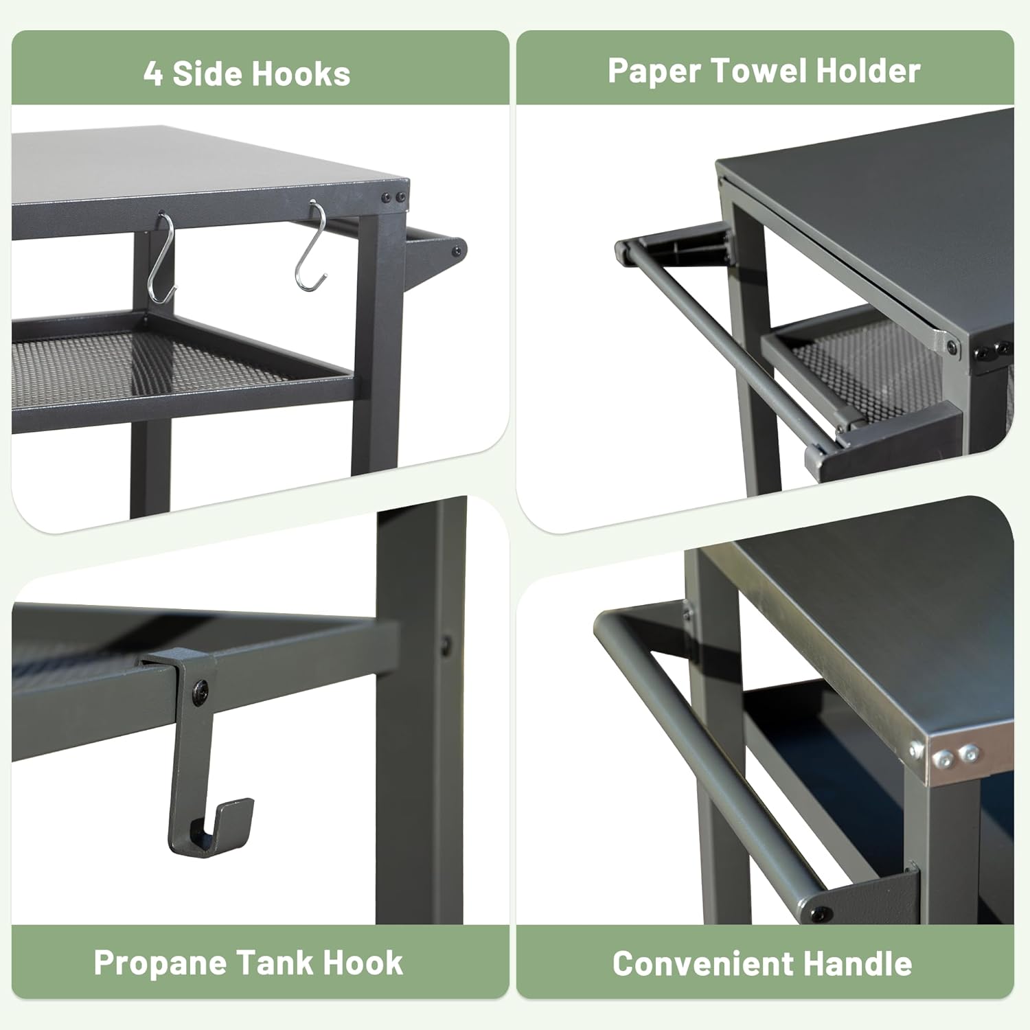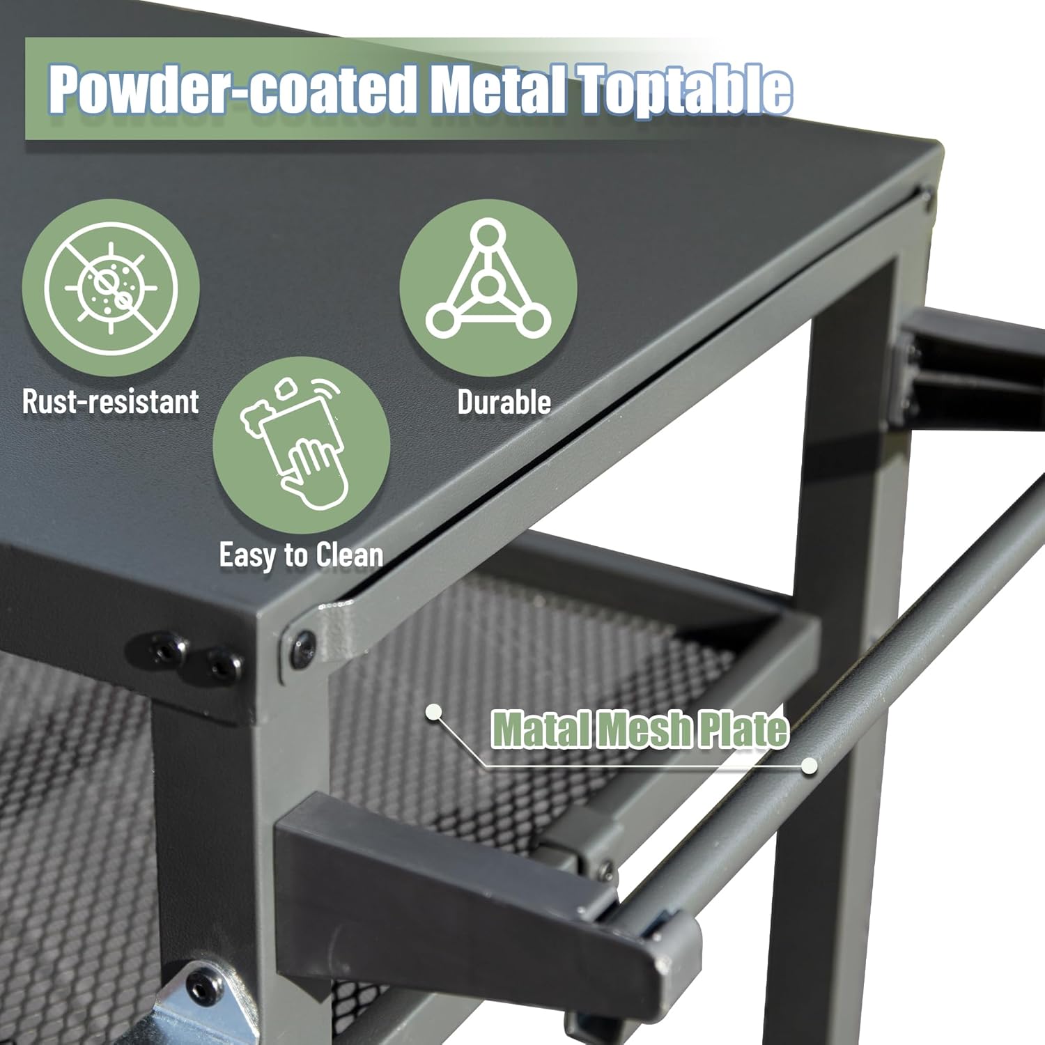 - Rust-Proof Countertop-- Domi food prep table enjoys a durable powder-coated metal countertop that is resistant to rust, ensuring longevity and easy maintenance for your outdoor grilling adventures.