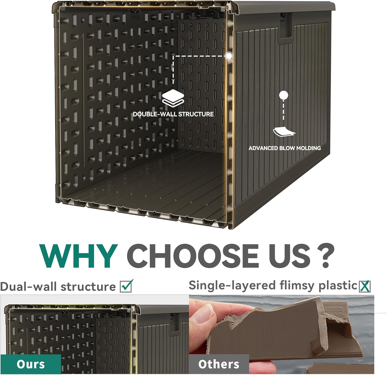 - DOUBLE-WALL CONSTRUCTION:Unique dual wall structure raises sturdiness & durability to the next level; All-weather guard resin pairs with wooden texture to impart a sleek texture for lasting outdoor use