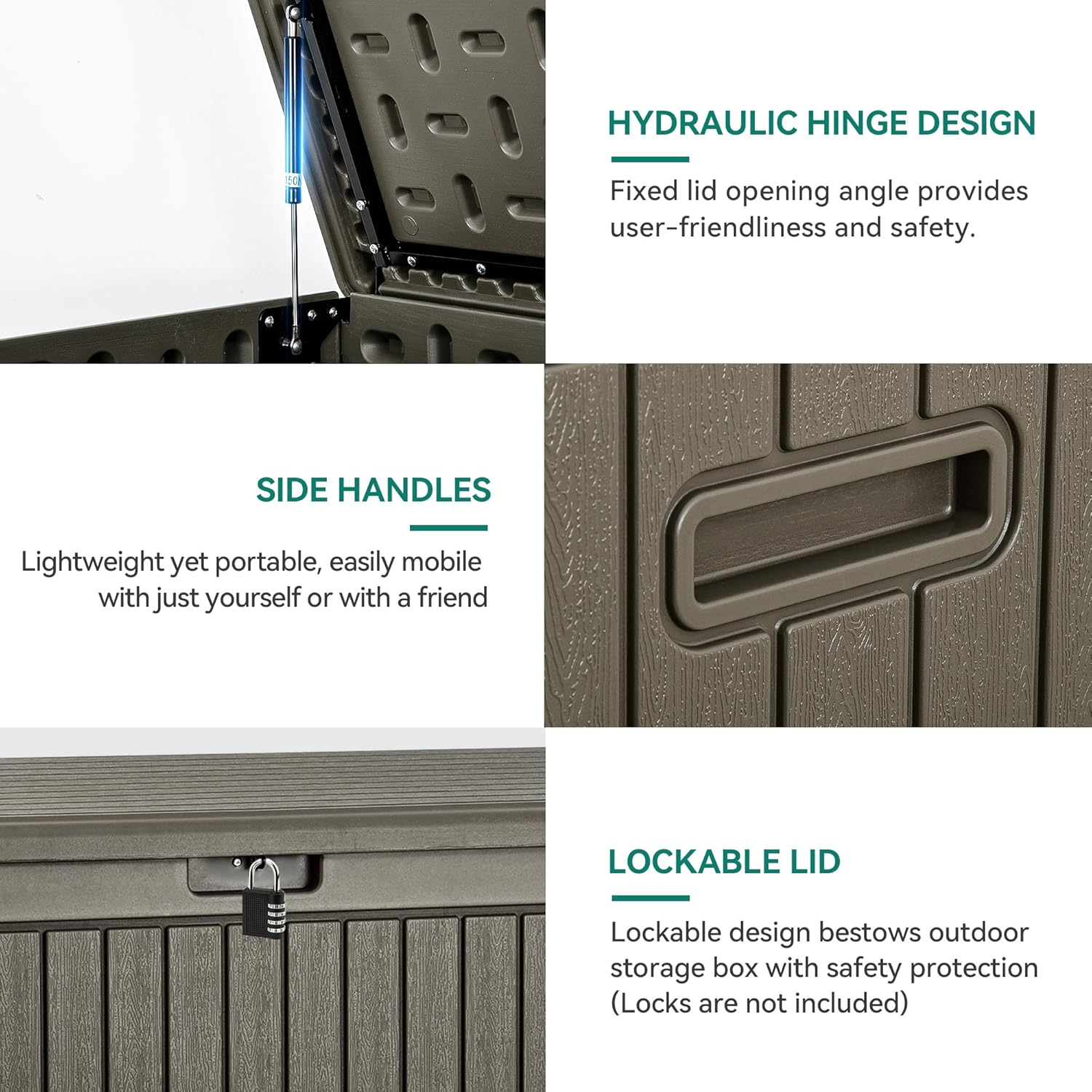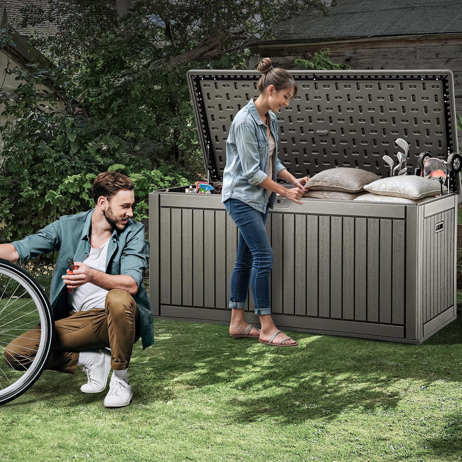 - MULTIPURPOSE GARDEN STORAGE:Doubles as an extra table or bench to accommodate six adults of up to 1000lbs., this deck box blends into any yard or patio while storing patio cushions, gardening tools, pool supplies, etc