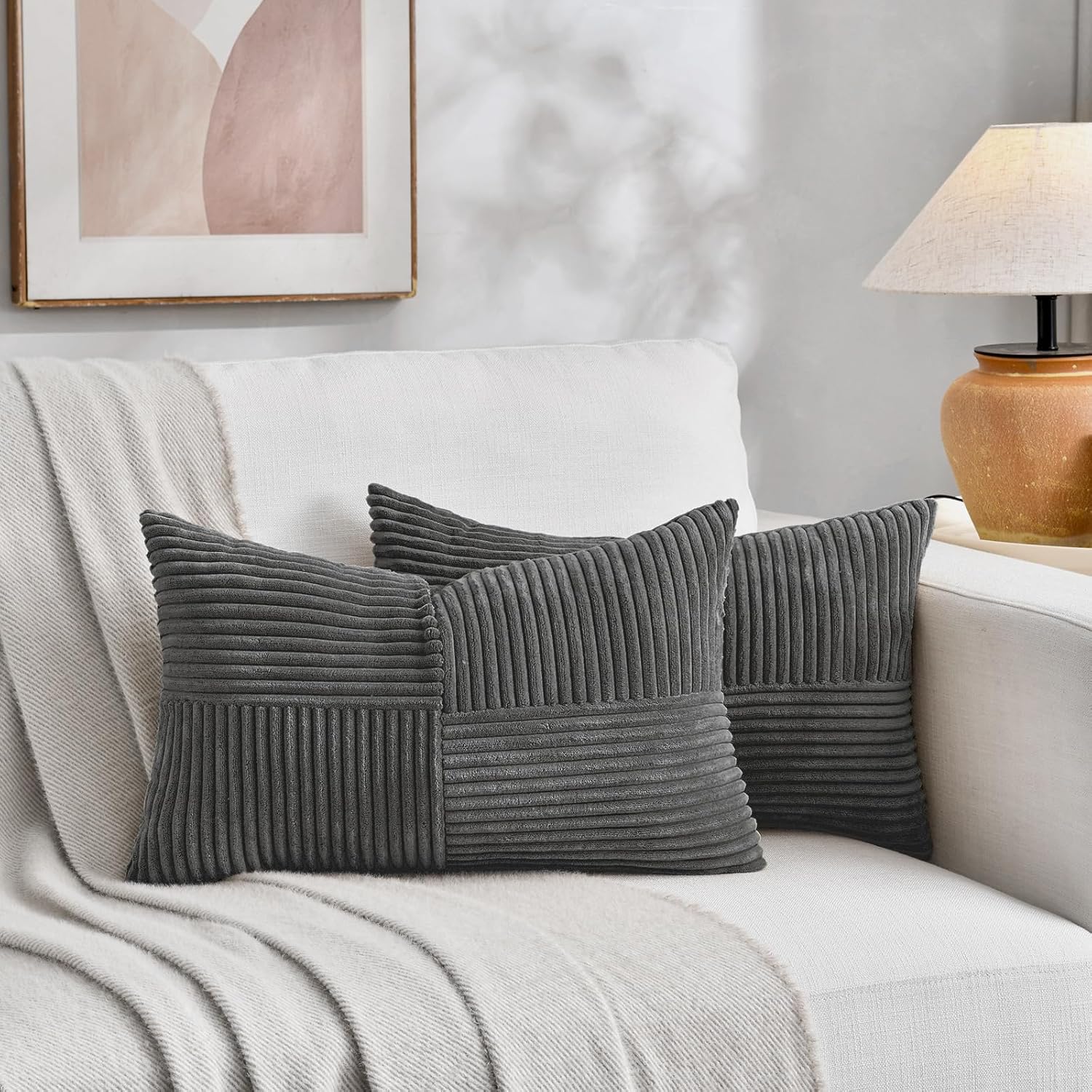 Fancy Homi 2 Packs Dark Gray Lumbar Decorative Throw Pillow Covers 14x24 Inch for Living Room Couch Bed Sofa, Farmhouse Home Decor, Soft Striped Corduroy Rectangle Accent Cushion Case 35x60 cm