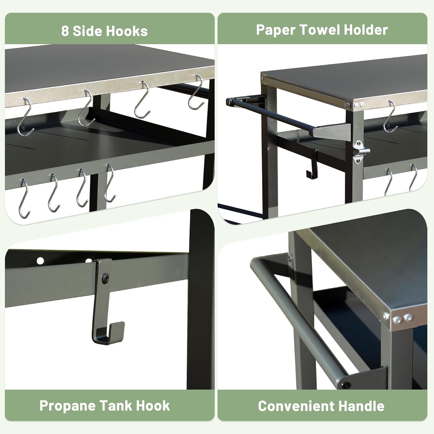 - Full & Useful Accessories- The food prep cart table includes paper towel holder, paper tissue holder, propane tank hook, bottle opener, 8 multi-functional tool hooks, etc, organizing all your favourite utensils for different cooking propose.