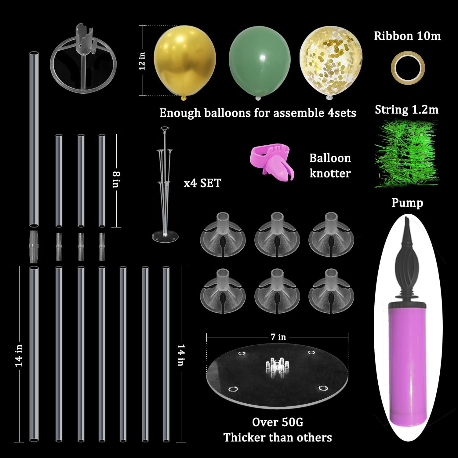 - WHAT INLCUDE: This balloon stand kit include 4 set balloon holders, 35pcs balloons - green balloons, gold and confetti balloons, balloon pump, balloon clips, ribbons, glue dots and tie tool