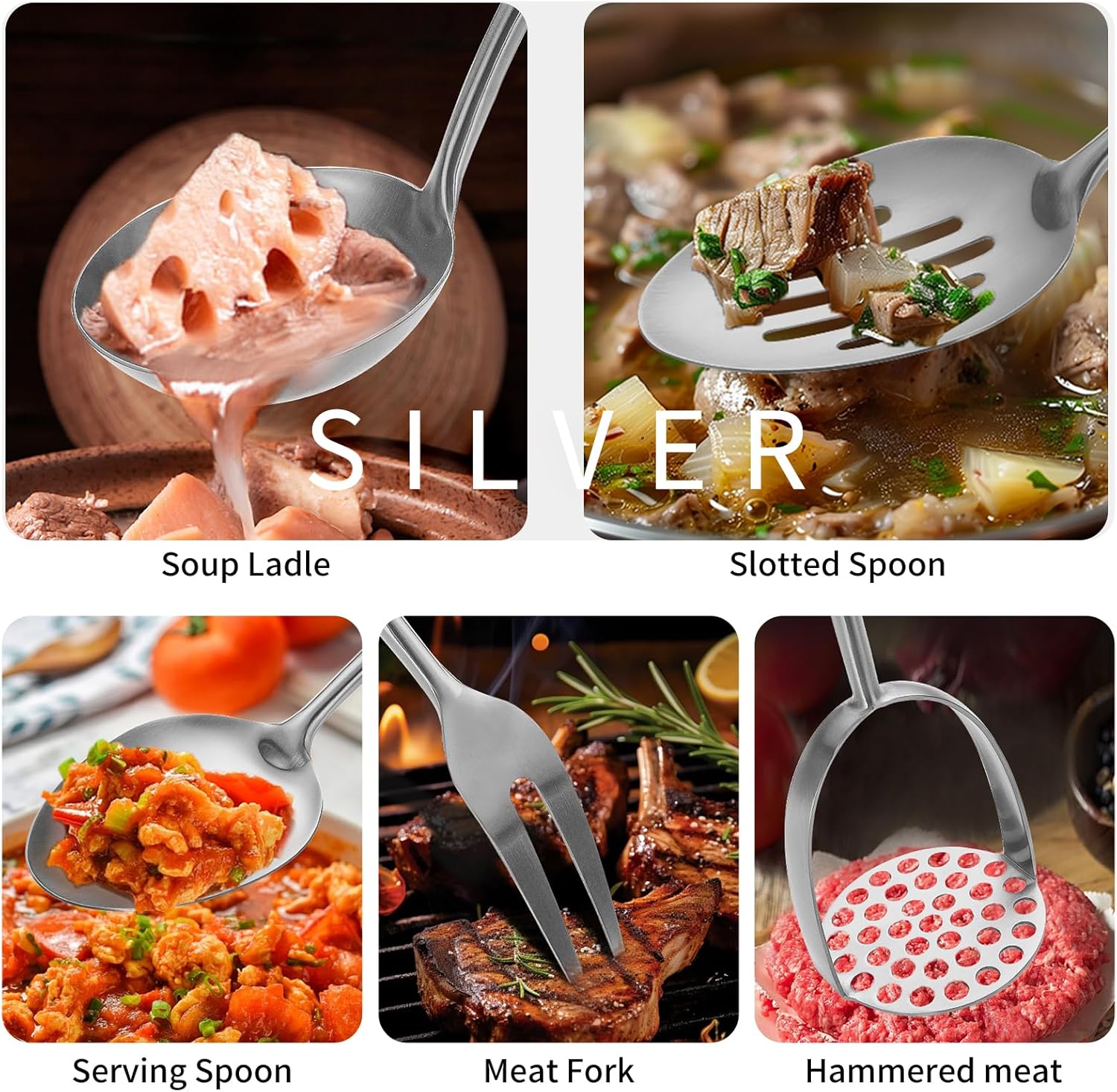 304 Stainlss Steel Kitchen Utensils Set, 12 Pcs Long Metal Cooking Utensil Gadgets Tools Set with Spatula, Ladle, Spoon, Ladle, Skimmer, Tunner, Pasta Server, Tongs(Silver, Dishwasher Safe)