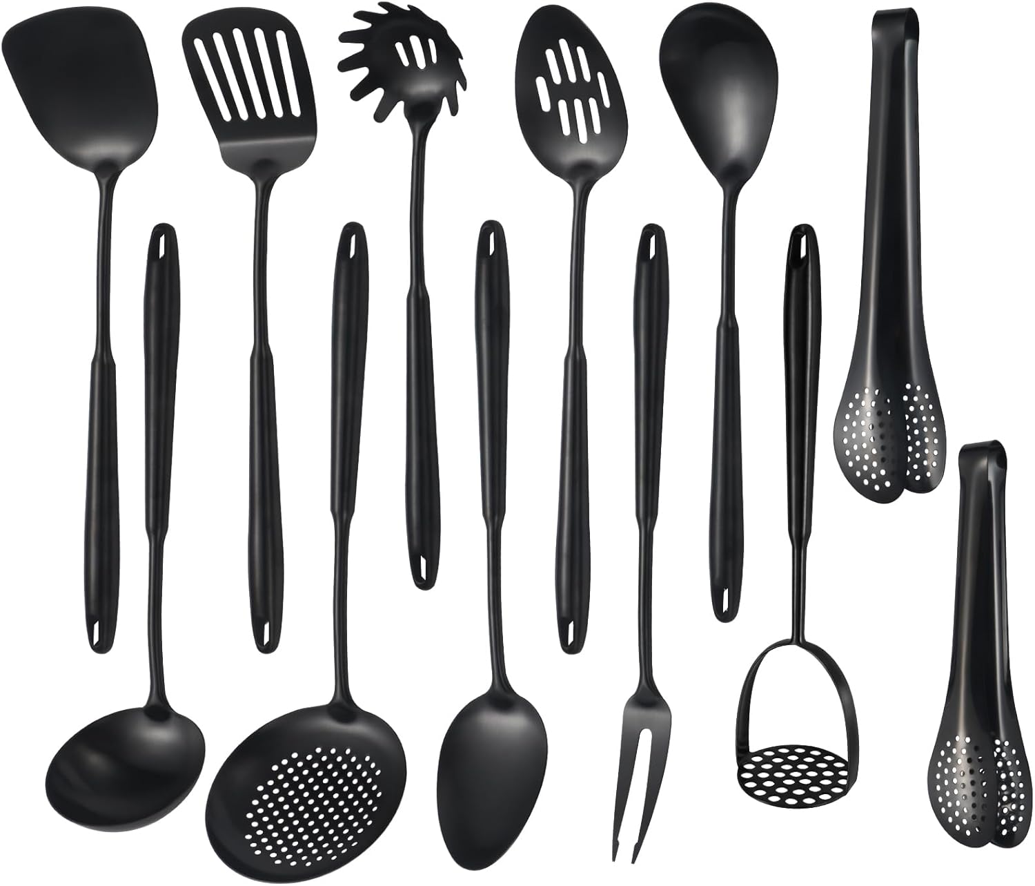304 Stainlss Steel Matte Kitchen Utensils Set, 12 Pcs Long Metal Cooking Utensil Gadgets Tools Set with Spatula, Ladle, Spoon, Ladle, Skimmer, Tunner, Pasta Server, Tongs(Black, Dishwasher Safe)