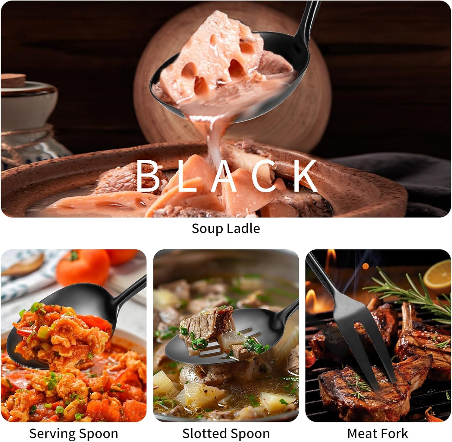 - 12Pcs Kitchen Utensils Set: Lazycorner Utensils Serving Set consists of 1 Soild Turner, 1 Soup Ladle, 1 Slotted Spoon, 1 Slotted Spatula Tunner, 1 Pasta Server, 1 Large Spoon, 1 spaghetti spoon, 1 Serving Spoon, 1 Slotted Spoon, 1 Meat Fork, 2 Serving Tongs. Enhance your cooking experience with 11 kitchen accessories that perfectly for your cooking needs