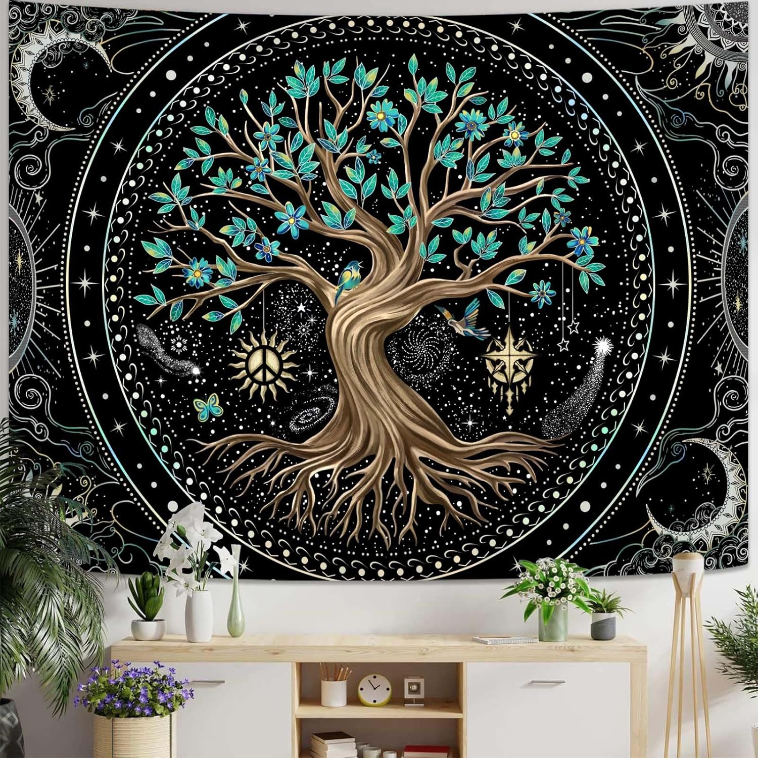 - Elegant Tree of Life Design: This tapestry features a beautifully detailed Tree of Life at the center, surrounded by celestial elements such as the moon, stars, and butterflies. The intricate design adds a spiritual and serene ambiance to any room, perfect for meditation spaces, bedrooms, or living rooms.
