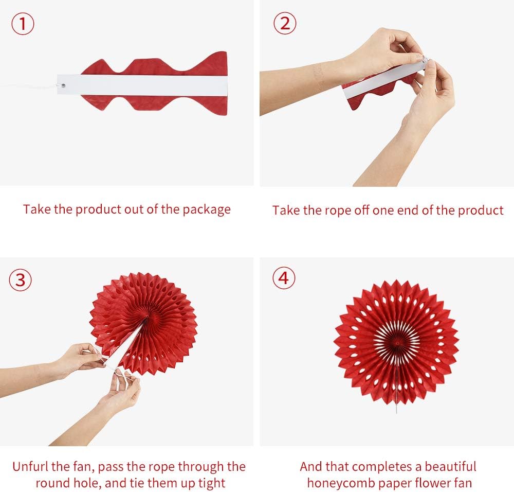 - 【Easy to assemble】: These hanging paper fans have a hanging string attached,just unfold the paper flower fan and fix it with the rope of the paper flower fan, then you can hang it to your favorite place and decorate your party perfectly in a few minutes.