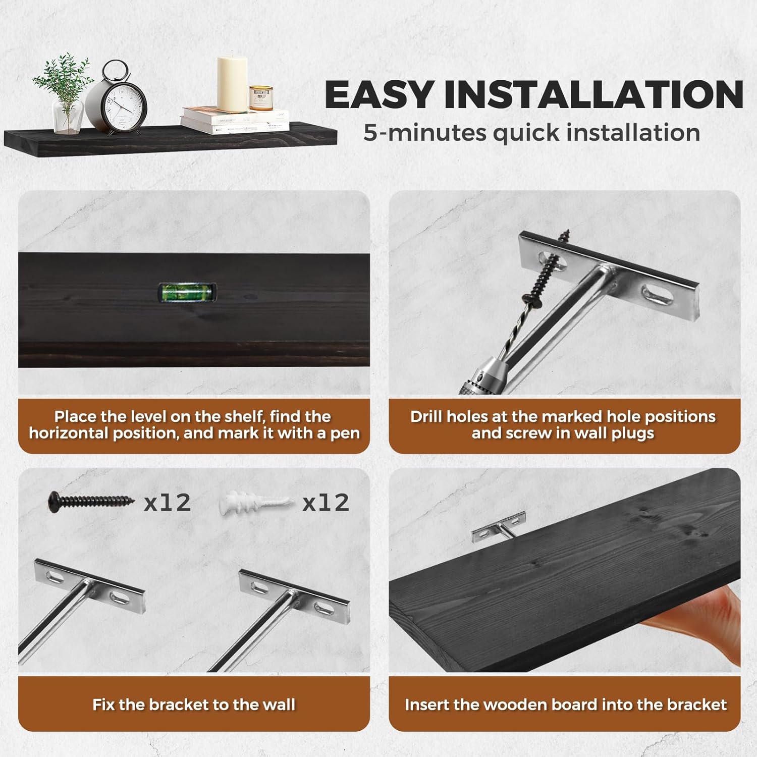 Floating Wall Shelves 2-Pack - 24-Inch Rustic Black Wooden Shelves for Storage and Décor, Easy Installation for Living Room, Bedroom, and Kitchen