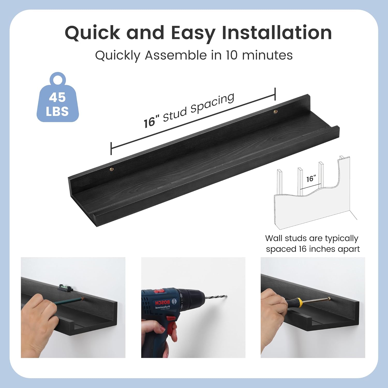 Picture Ledge Shelf for Wall, 24 inch Solid Pine Wood Nursery Book Shelves 2 Packs, Floating Ledge Shelves for Kids' Room Bedroom Bathroom Living Room Photo Frames Office Nursey Wall Decor, Black