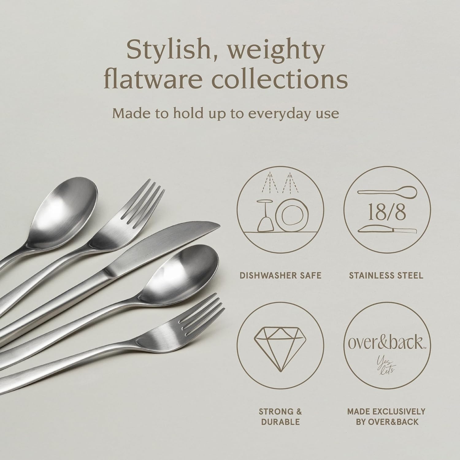 over&back 20pc Curved Flatware Cutlery Set - Comes with 4 Dinner Forks, 4 Salad Forks, 4 Dinner Knives, 4 Dinner Spoons, and 4 Teaspoons - 18/8 Stainless Steel - Dishwasher-Safe - Brushed Stainless