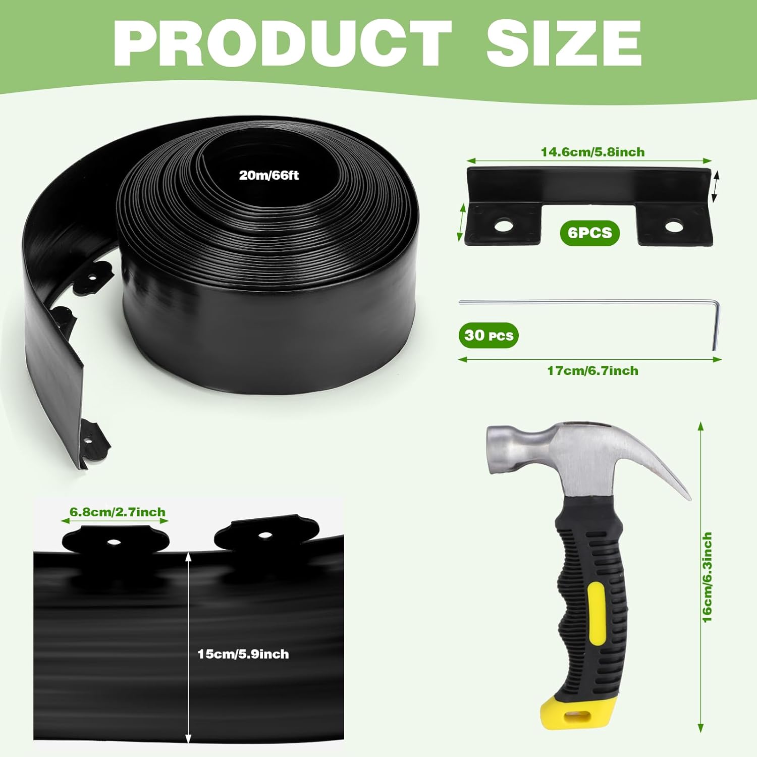 - Package Content: the package provides most of your needs to achieve a well defined and neatly organized lawn or garden, along with the 66 ft edging for landscaping, it also includes 6 connectors, 60 spikes and 1 hammer, which enhance the convenience of installation and ensure a secure and sturdy edging for your landscaping