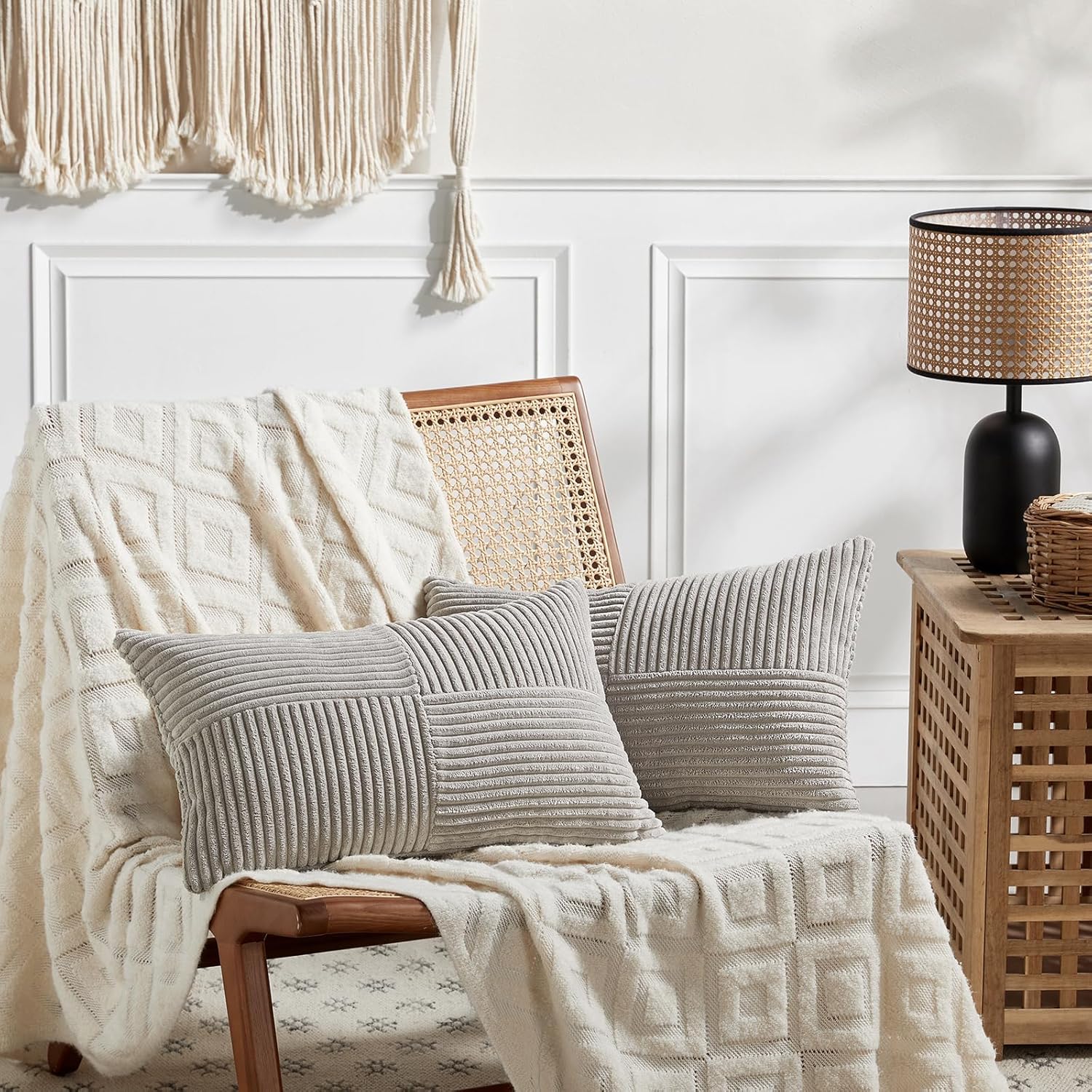 Fancy Homi 2 Packs Neutral Grey Lumbar Decorative Throw Pillow Covers 12x20 Inch for Living Room Couch Bed Sofa, Farmhouse Home Decor, Soft Striped Corduroy Rectangle Accent Cushion Case 30x50 cm
