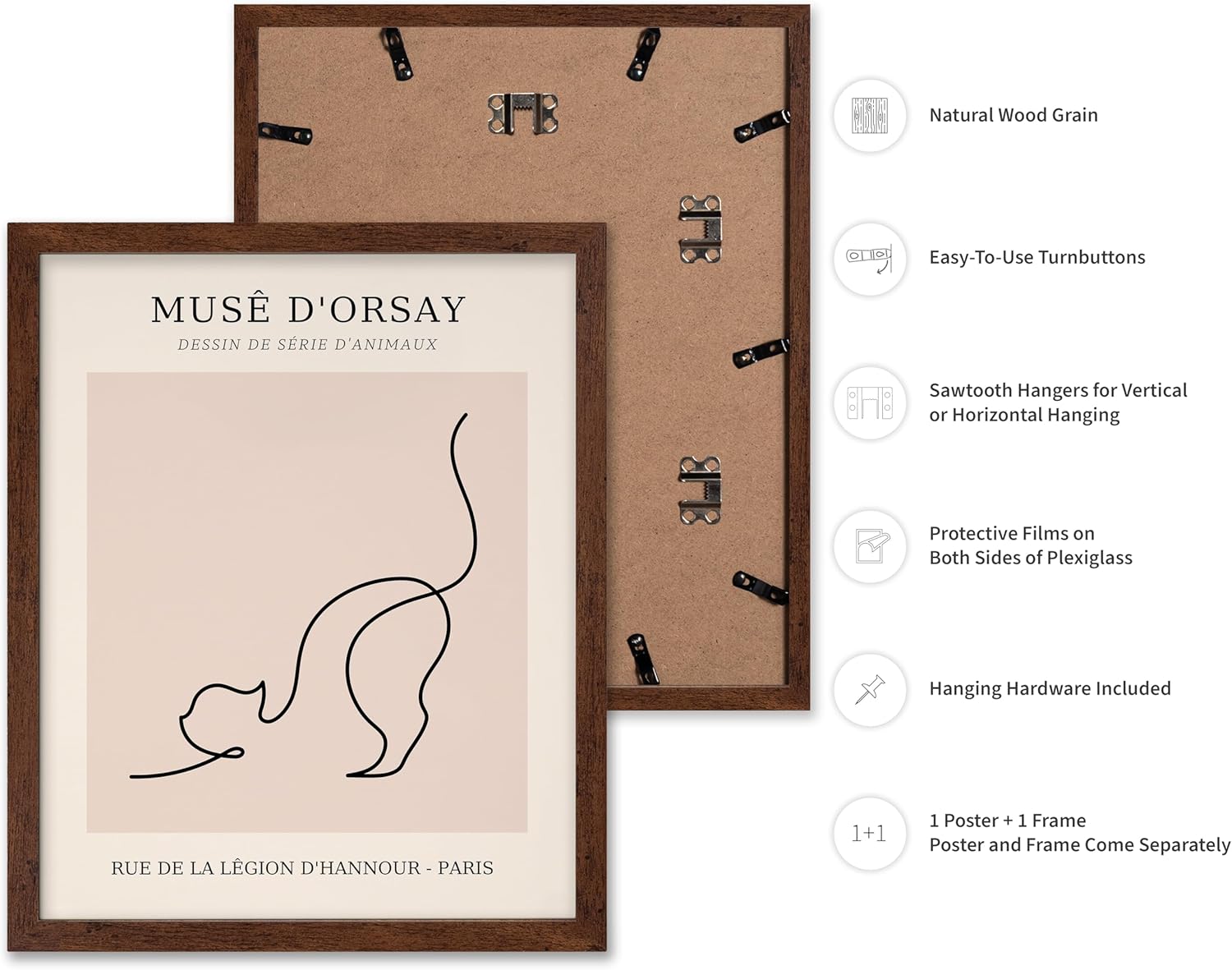 Poster Master Vintage Poster - Retro One Line Cat Drawing Print - Cat Art - Minimal Gift for Men, Women, Animal Lover - Abstract Wall Decor for Home, Office, Bedroom, 11x14 Brown Framed