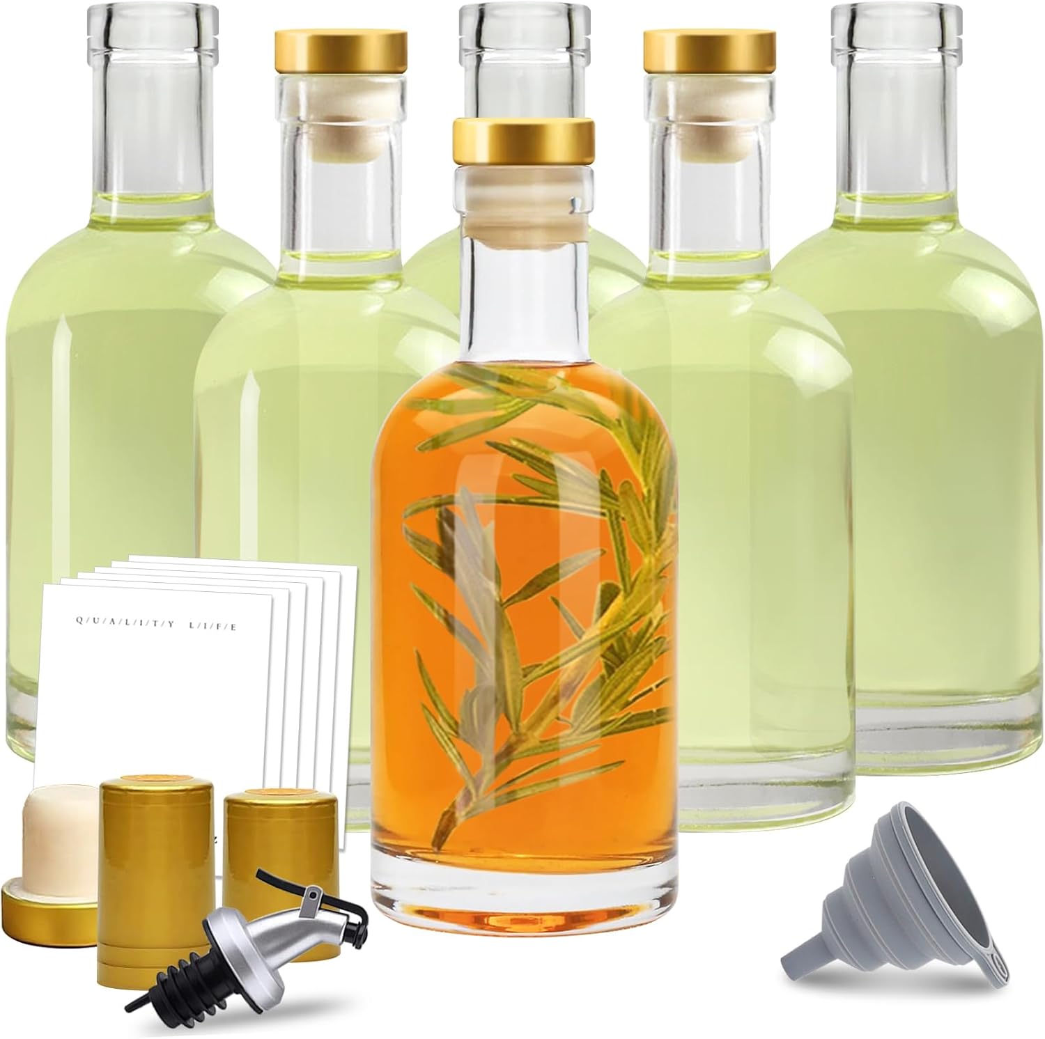 Olive Oil Dispenser Bottle for Kitchen, Clear Glass Oil and Vinegar Dispenser Set, Coffee Syrup Dispenser, Container With Metal Pour Spout, Airtight Lid, Funnel, Waterproof Labels (200ml-6 Pack)