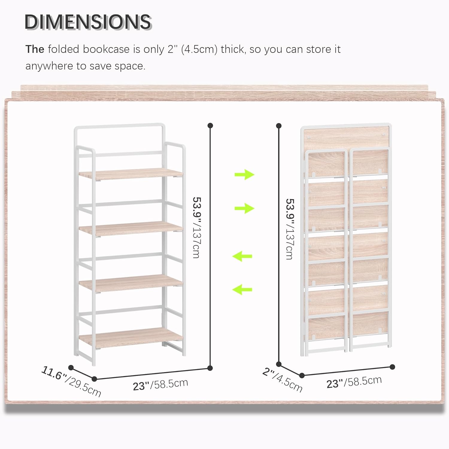 4NM No Assembly Foldable Bookshelf, 4-Shelf Collapsible Bookcase Storage for Small Spaces, 54" H, Natural White
