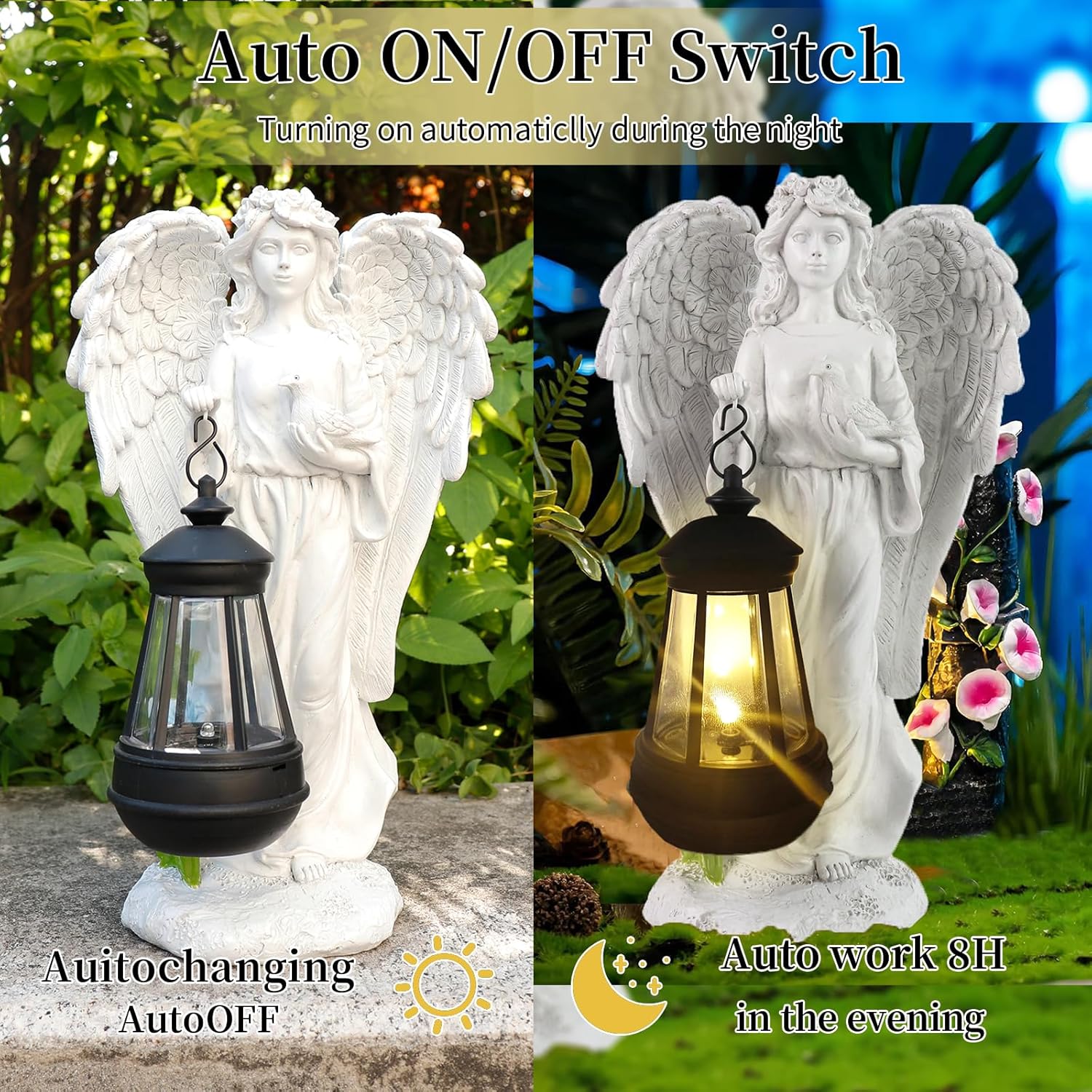 - ♥️【Guardian Angel Solar Statue】- Our angel garden statue carrying a solar lantern which features a warm white light effect, simple lines and all antique white are simple and elegant, adding a magical and enchanting ambiance to your outdoor space. Simulate watering effect, This yard solar angel statue brings color and life to your home, garden, yard as it shines in the sunlight and light up in your garden at night, which can add a touch of love and whimsy to any outdoor space.