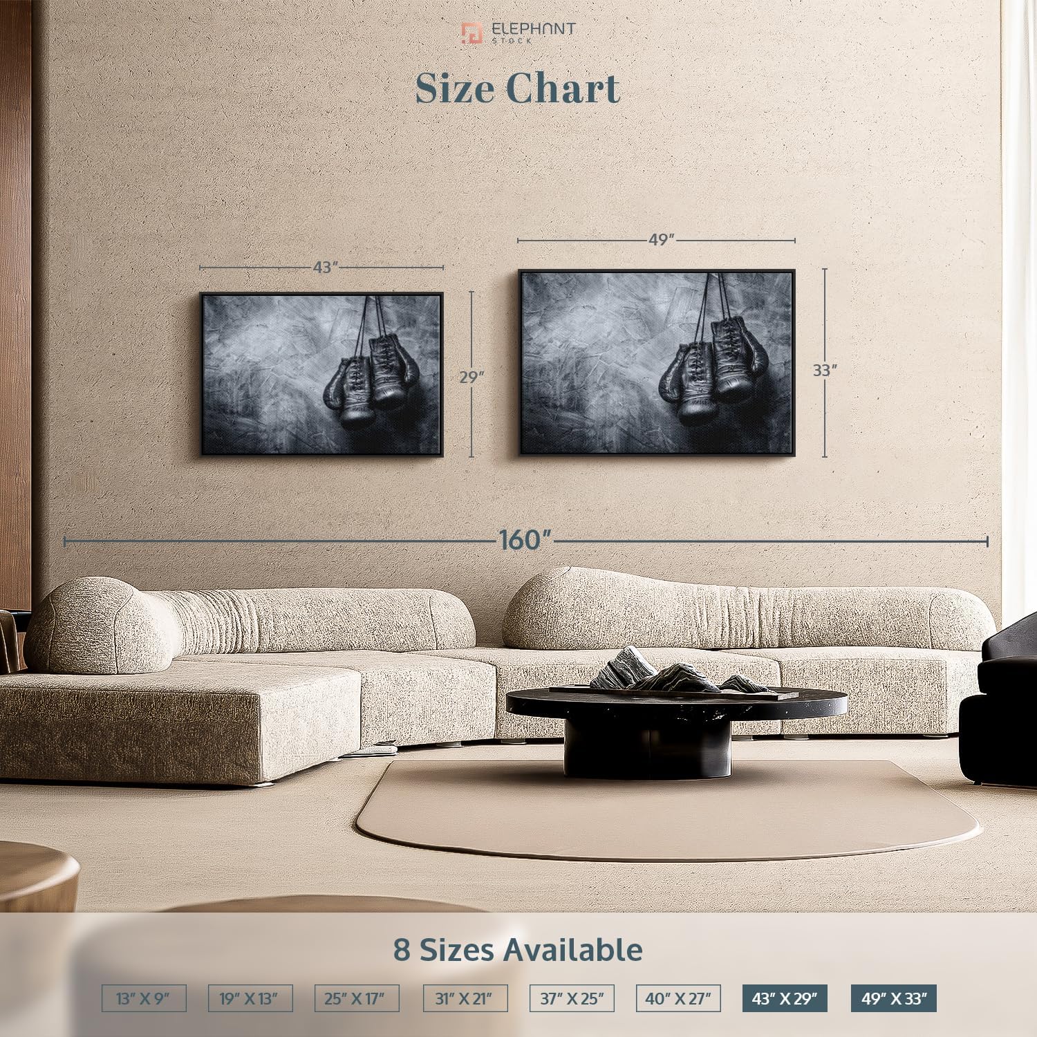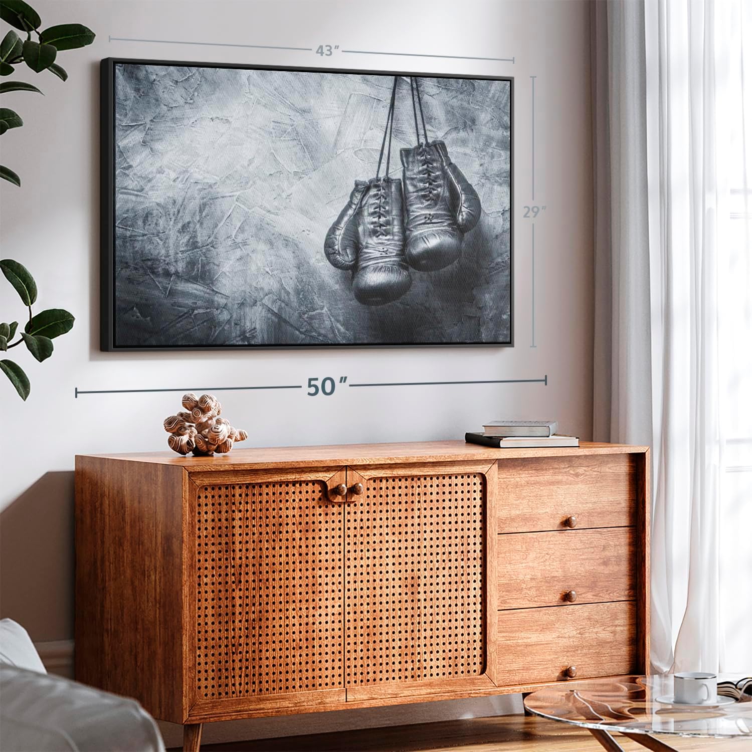 ElephantStock Boxing Gloves Wall Art - Horizontal Framed Canvas - 1-Piece Living Room Wall Decor - Photography Sports Canvas Print - Black and Gray Decor for Wall - 43" X 29"