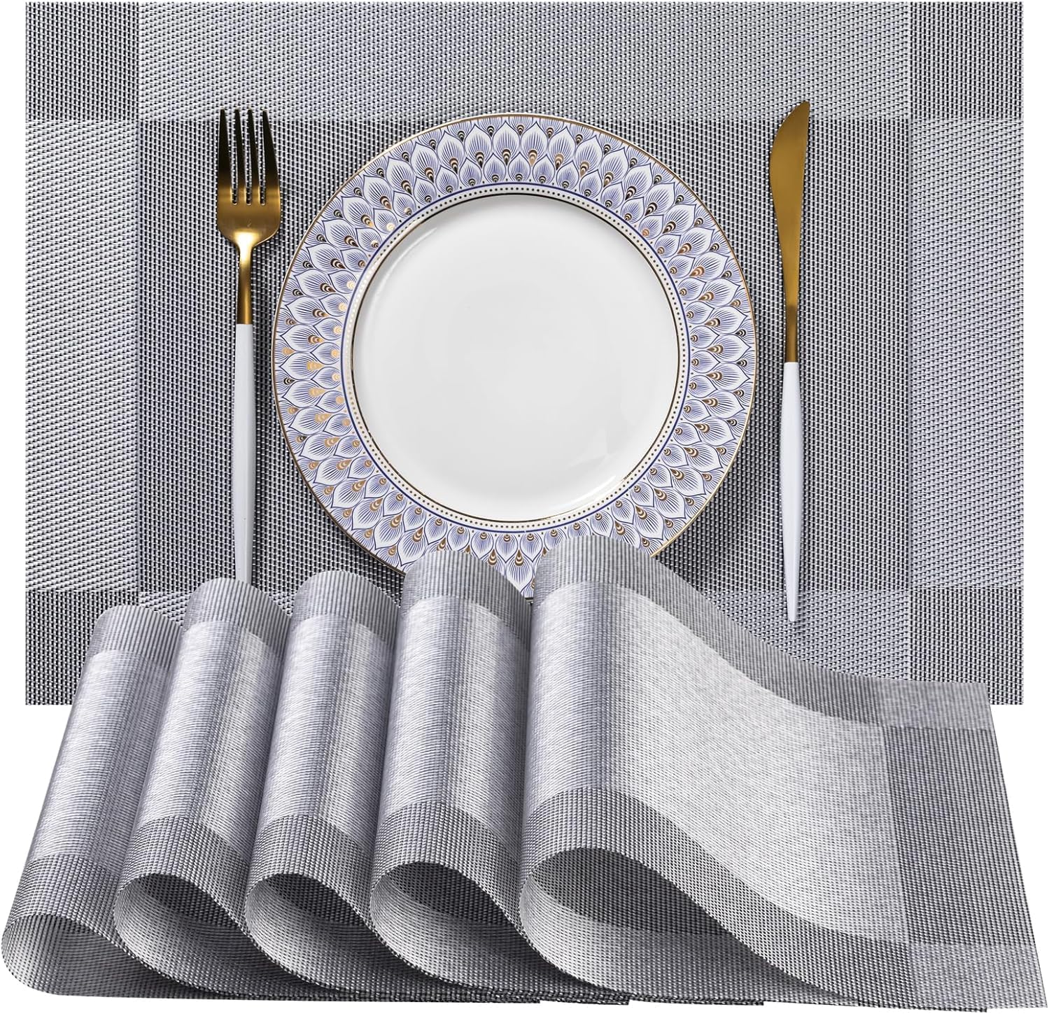LEXMORE Placemats Set of 6 Vinyl/Plastic Woven Place Mats for Kitchen Table Indoor/Outdoor Washable Placemat Wipeable Dining Table Mats(G-Silver Cube)