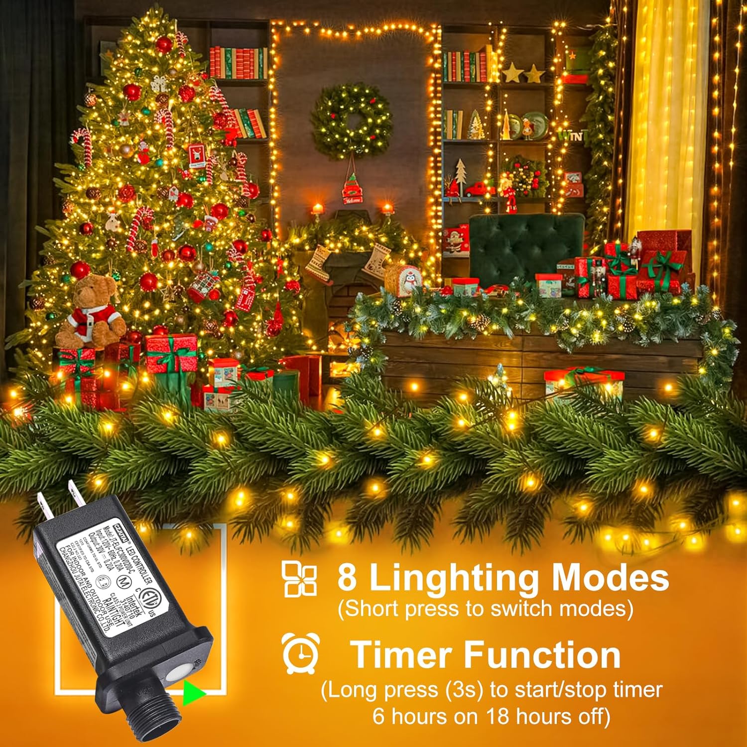 - 8 Lighting Modes: This warm white Christmas lights has 8 lighting modes to fit different occasion and mood needs, including combination, in waves, sequential, slo-glo, chasing/flash, slow fade, twinkle/flash, steady on, adjust the lighting modes by pressing the round button on the adapter. The perfect ambient light for family gatherings and holiday celebrations.