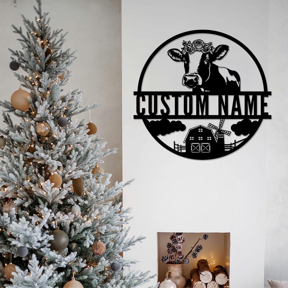 Custom Cow Metal Sign, Personalized Family Name Wall Art, Farmhouse Customized Gifts for Farmer, Flower Monogram Decor for Living Room Indoor Outdoor Hanging