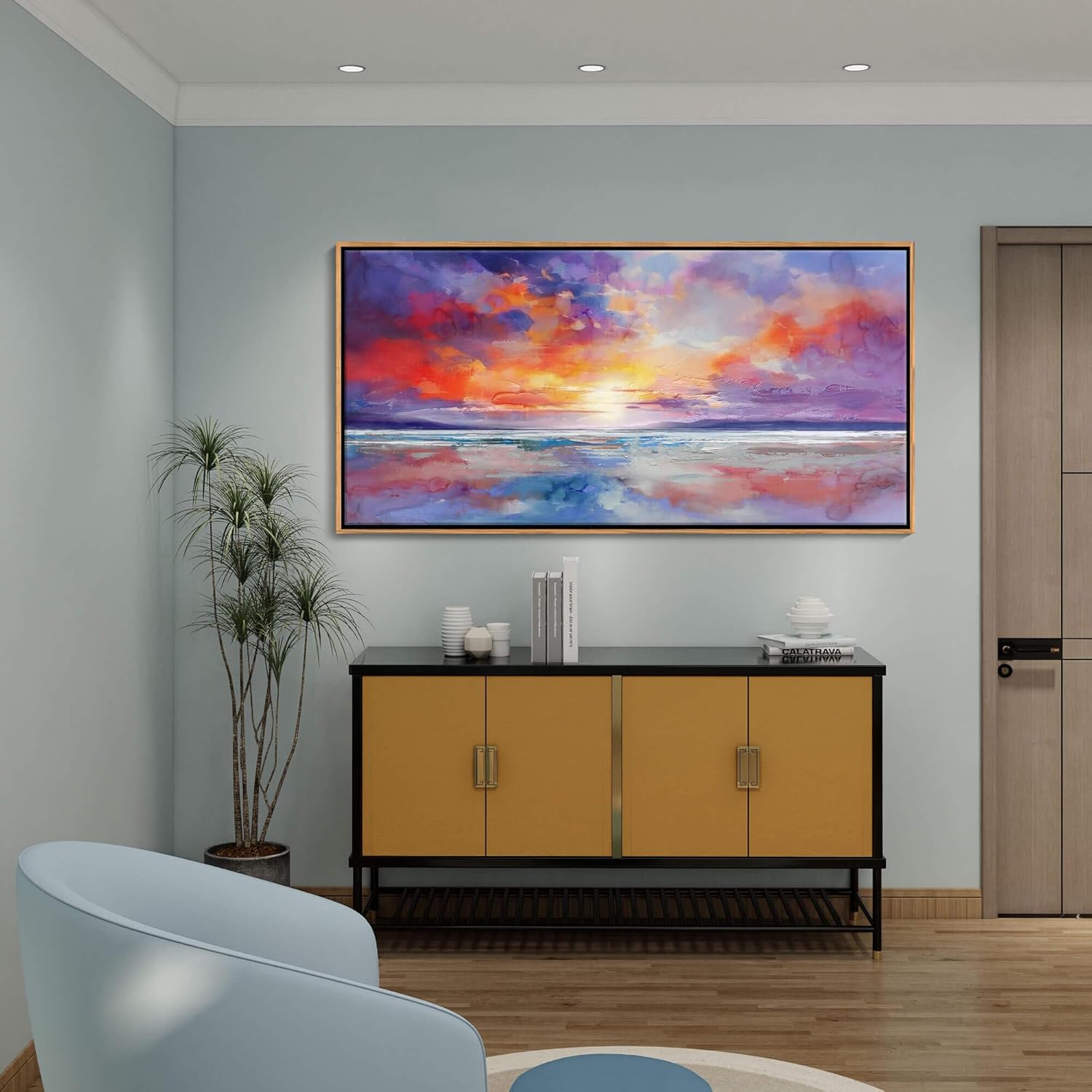DUNHUANG ART Vibrant Orange Sunset Wall Art - Colorful Ocean Abstract Beach Decor for Living Room & Bathroom - Large Framed Coastal Seascape Picture - Ocean Sunrise Poster for Home Decoration 20"x40"