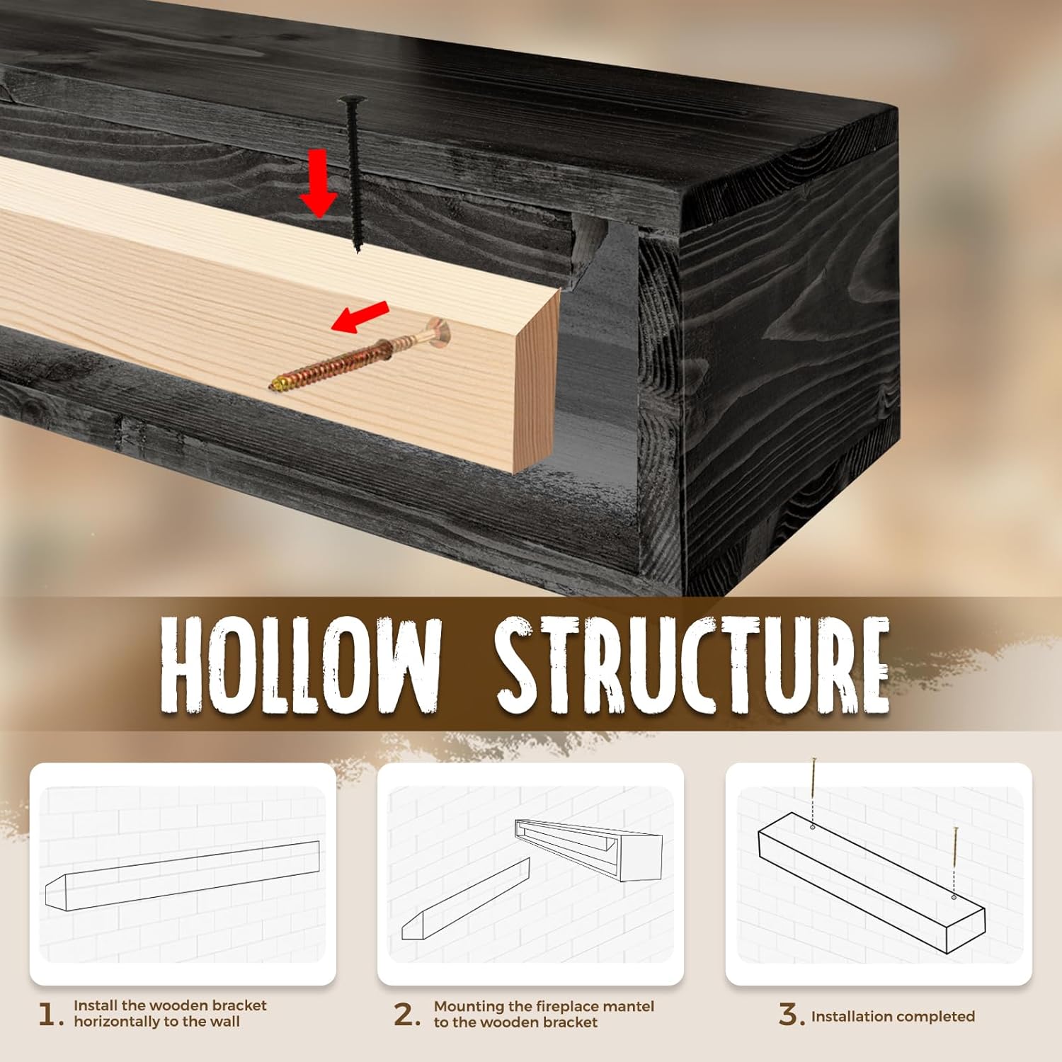 - Easy Installation: Our solid wood mantels come with hidden wood brackets, which can be easily fixed to the wall. Our hollow structure design ensures easy installation. The package includes installation instructions and two sets of accessories, compatible with hollow walls (drywalls) and solid walls (brick walls). For any installation issues, feel free to contact us at any time