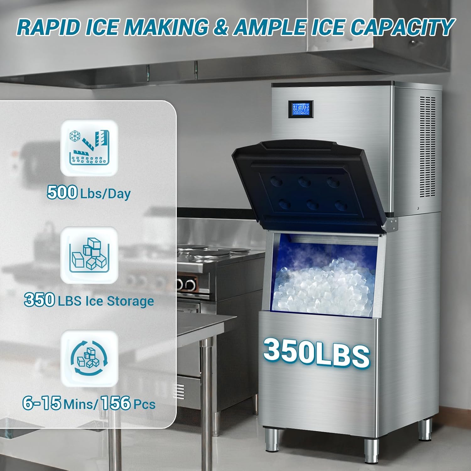 Large Commercial Ice Maker Machine: 500lbs/24H Production, with 350lbs Ice Storage Bucket, 156 Ice Cubes in 6-15 Mins - Stainless Steel Industrial Ice Maker for Restaurant, Bar, Cafe, Commercial Use