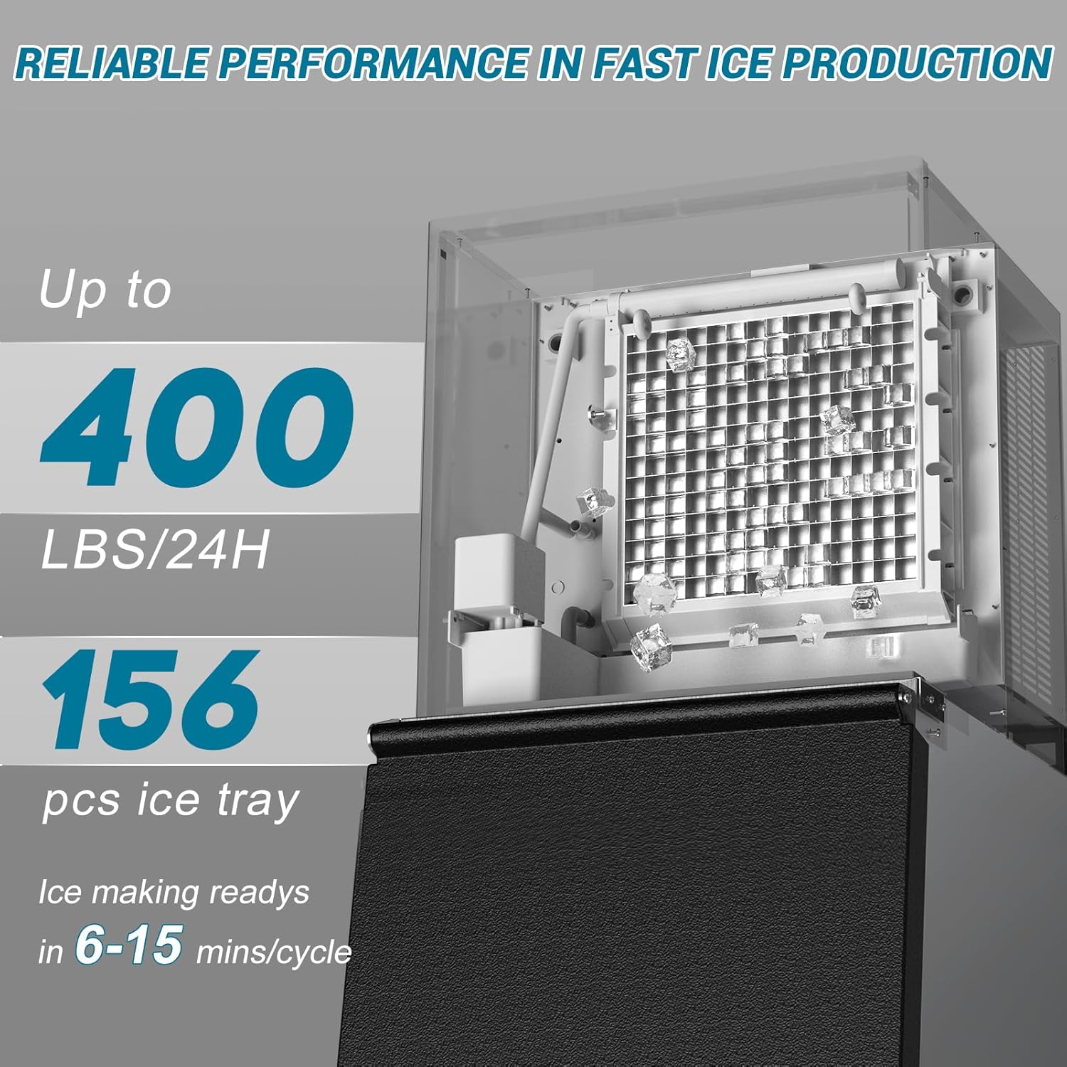- High Ice Production Capacity & Ample Ice Storage Capacity - The commercial ice machine has a remarkable production capacity of 400lbs of ice per 24-hour cycle, and with its impressive 350lbs ice storage bucket, ensuring an abundant supply of ice for your business needs.