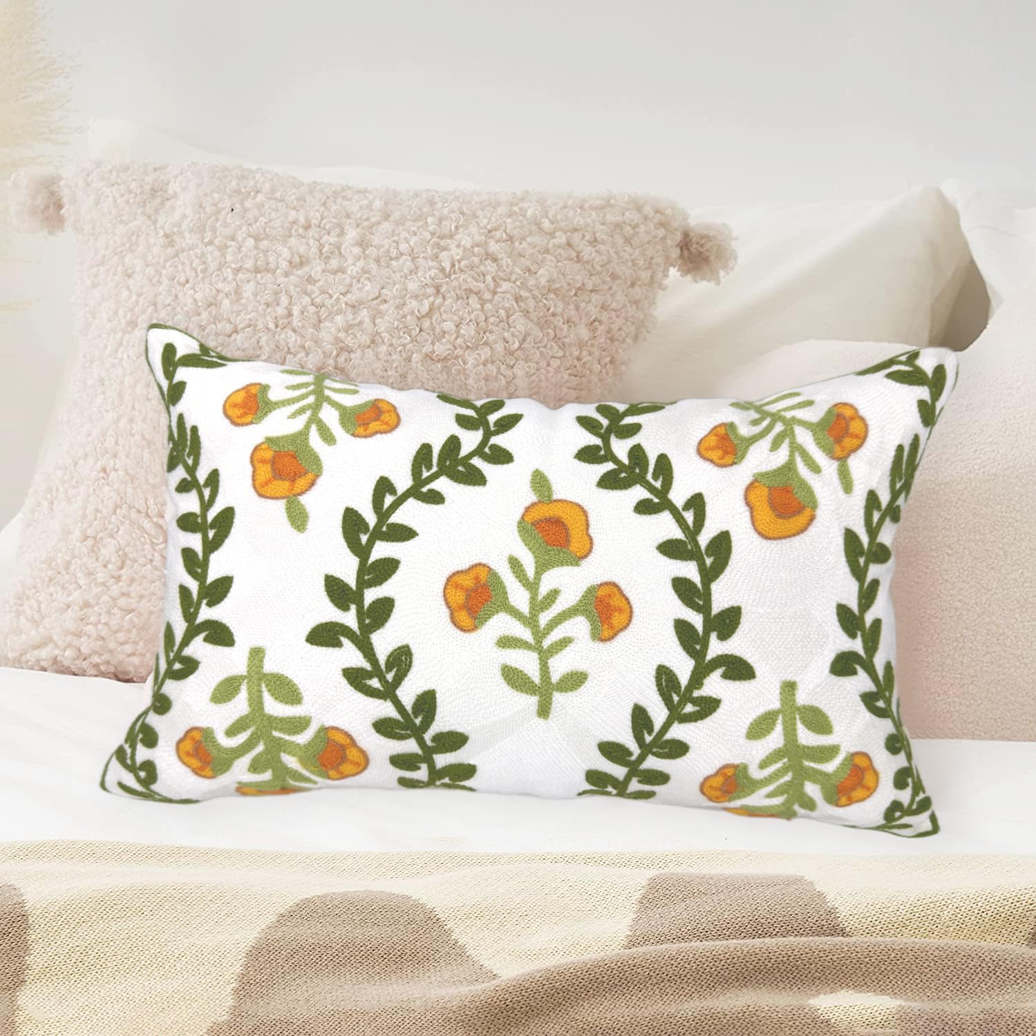 Alysheer Flower Embroidered Summer Decorative Lumbar Throw Pillow Cover 12"x 20", Farmhouse Cottage Orange Floral Green Leaves Patterned Cotton Canvas Cushion Case for Sofa Couch Bed Living Room