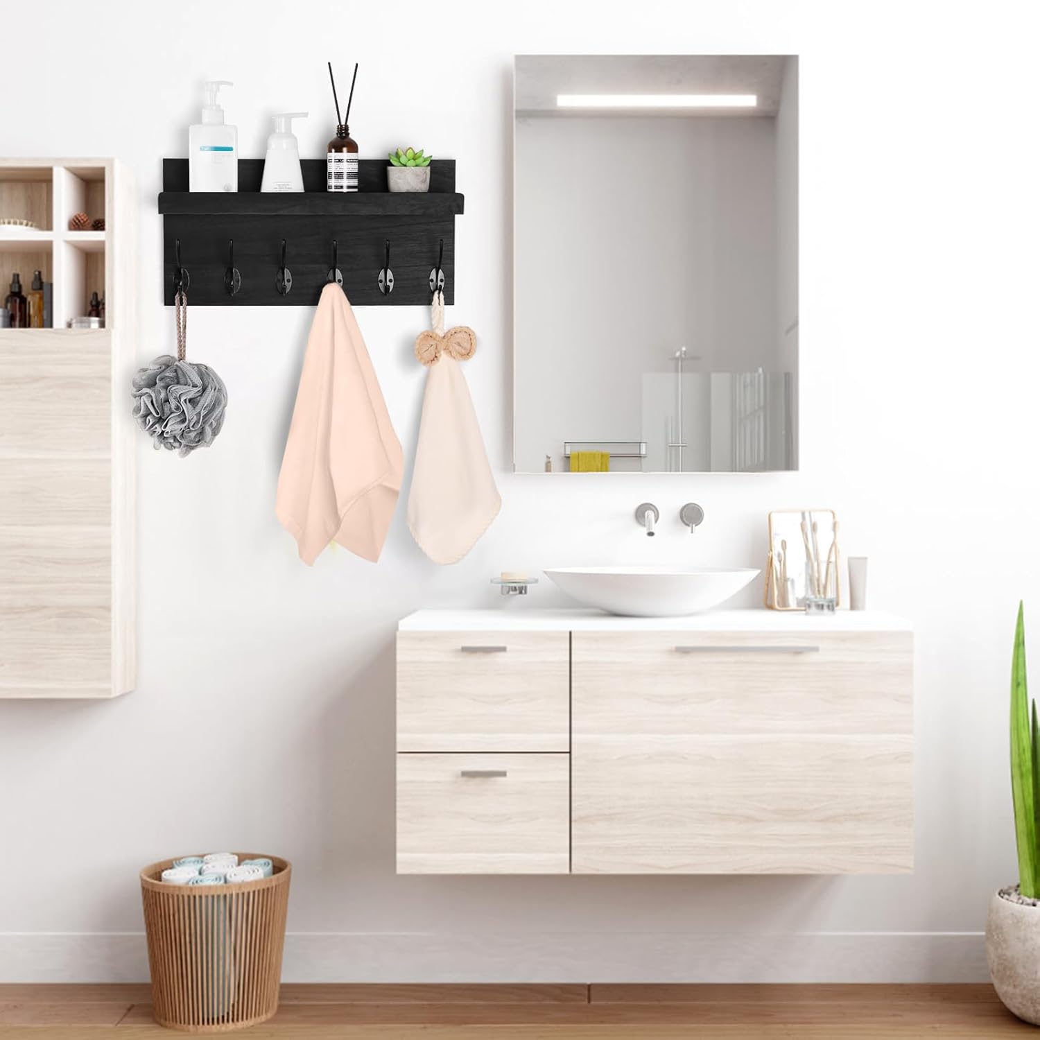 Shelf with Hooks, Coat Rack Wall Mount with 6 Double Metal Hooks, 17 Inch Farmhouse Wall Hooks with Shelf, for Entryway, Bathroom, Kitchen, Black