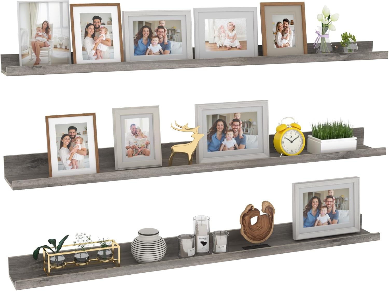 - Beautiful hanging shelves: These gray wall-mounted ledge shelves are both stylish and durable, made of high-quality medium-density fiberboard. The wood grain appearance adds a delicate touch to your room decor, making it more fashionable and modern