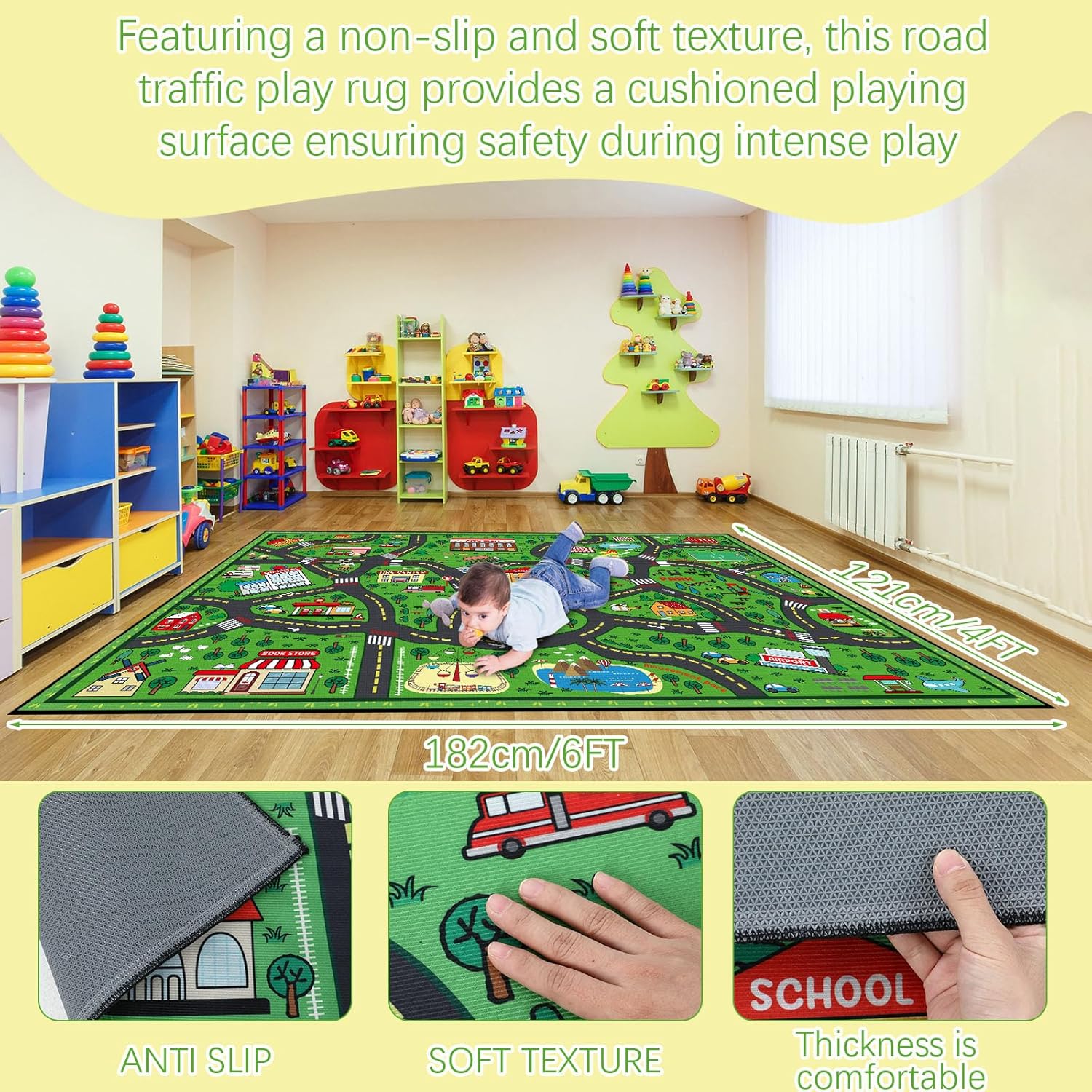 - Non Slip Kids Playroom Rug: this road traffic playrug featured with non slip and soft texture, provides a cushiony playfield that ensures safety during vigorous play; With a reliable non slip bottom, there's no risk of slipping or sliding; This kid baby and toddler friendly playrug ensure soft play times