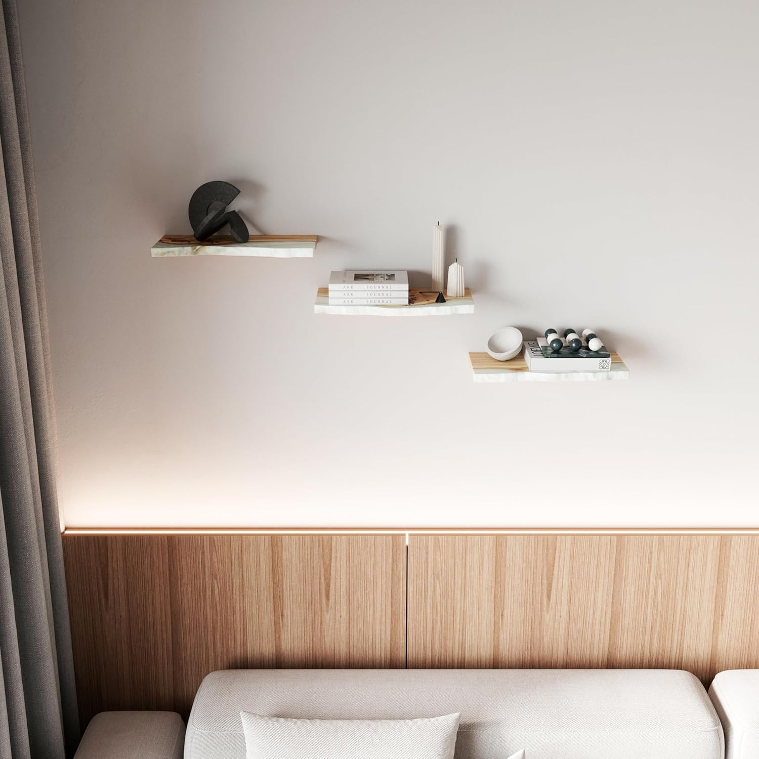 - Floating Design with Hidden Wall Mount: The innovative floating shelf design maximizes storage space while maintaining a clean, minimalist look. The hidden wall mount system ensures an easy and secure installation, allowing the shelves to appear as if they're floating.