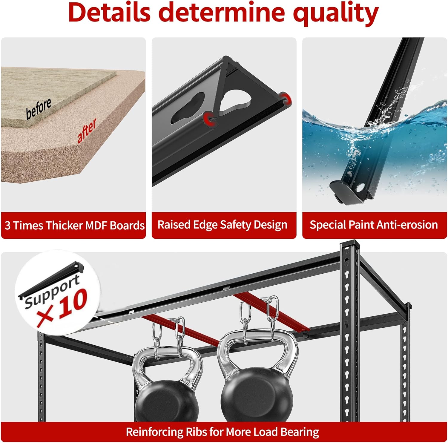 - γ3000LBS Capacity & 10 Support Ribs Garage ShelvingγGarage shelving is made of heavy duty metal. We have 2 support rods under each layer of MDF for this storage shelves, which can further increase the load bearing to meet ur needs for placing heavy objects. The thickened single-layer load-bearing capacity 600LBS and the total load-bearing capacity of 3000LBS. It is suitable for garage, workplaces, living room, kitchen, to store camping equipment, tools, kitchen supplies