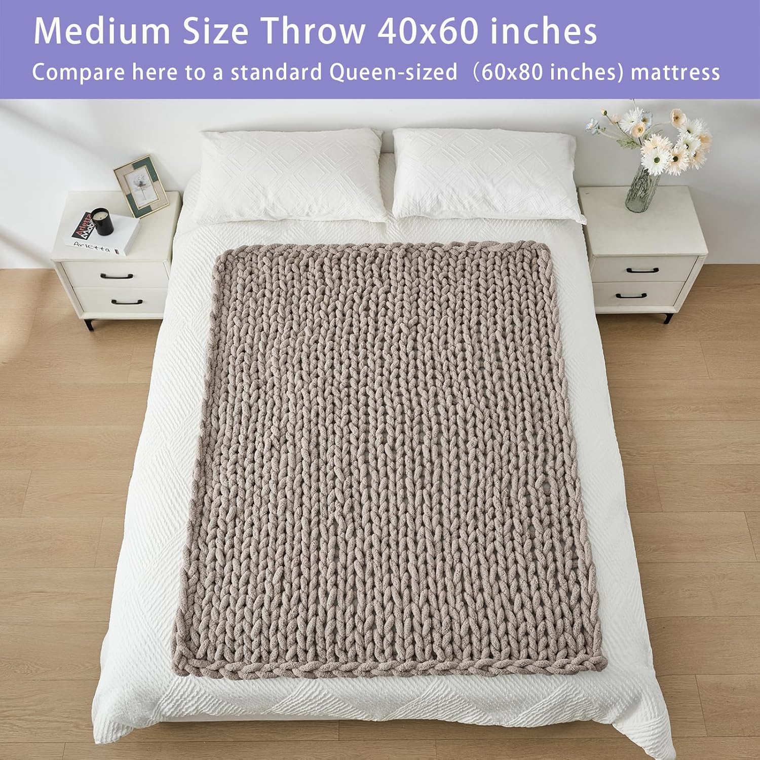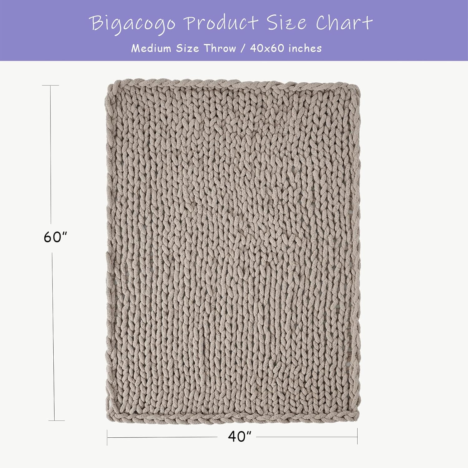 Bigacogo Chunky Knit Throw Blanket for Couch, 40x60 inches, 100% Hand Knitted with Thick Jumbo Chenille Yarn, Cozy Soft Large Rope Knot Cable Crochet Blankets for Sofa Bed Living Room, Taupe