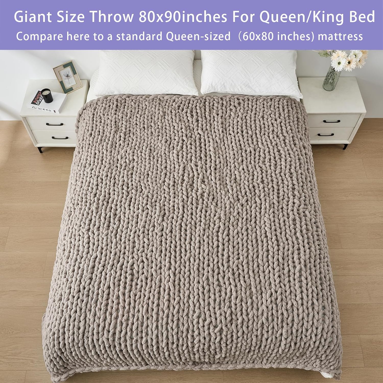 Bigacogo Chunky Knit Throw Blanket for Couch, 80x90 inches, 100% Hand Knitted with Thick Jumbo Chenille Yarn, Cozy Soft Large Rope Knot Cable Crochet Blankets for Sofa Bed Living Room, Taupe