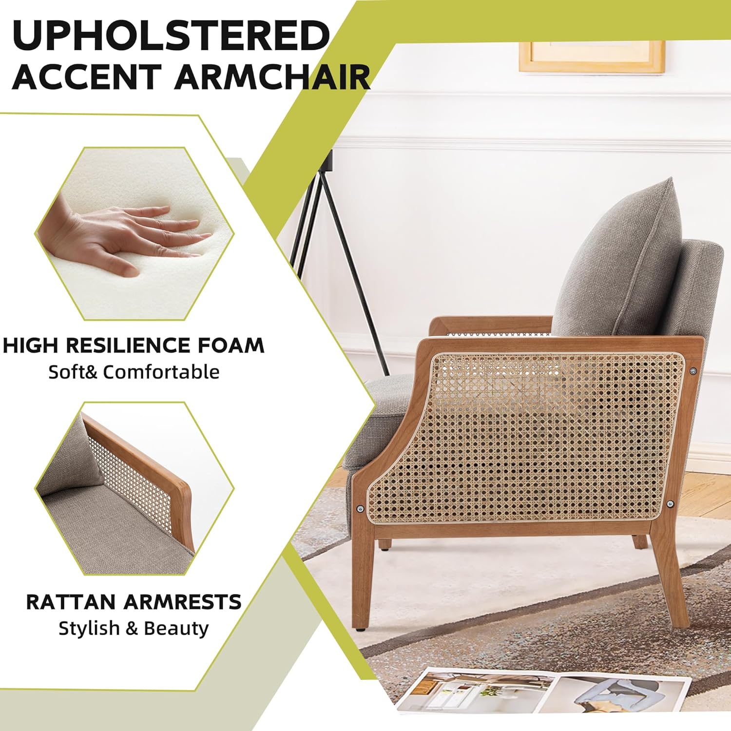 HAOBO Home Mid Century Modern Accent Chair Upholstered Living Room Chairs Armchair with Rattan Armrest Comfy Reading Chair with Wood Frame Lounge Side Chair with Waist Cushion