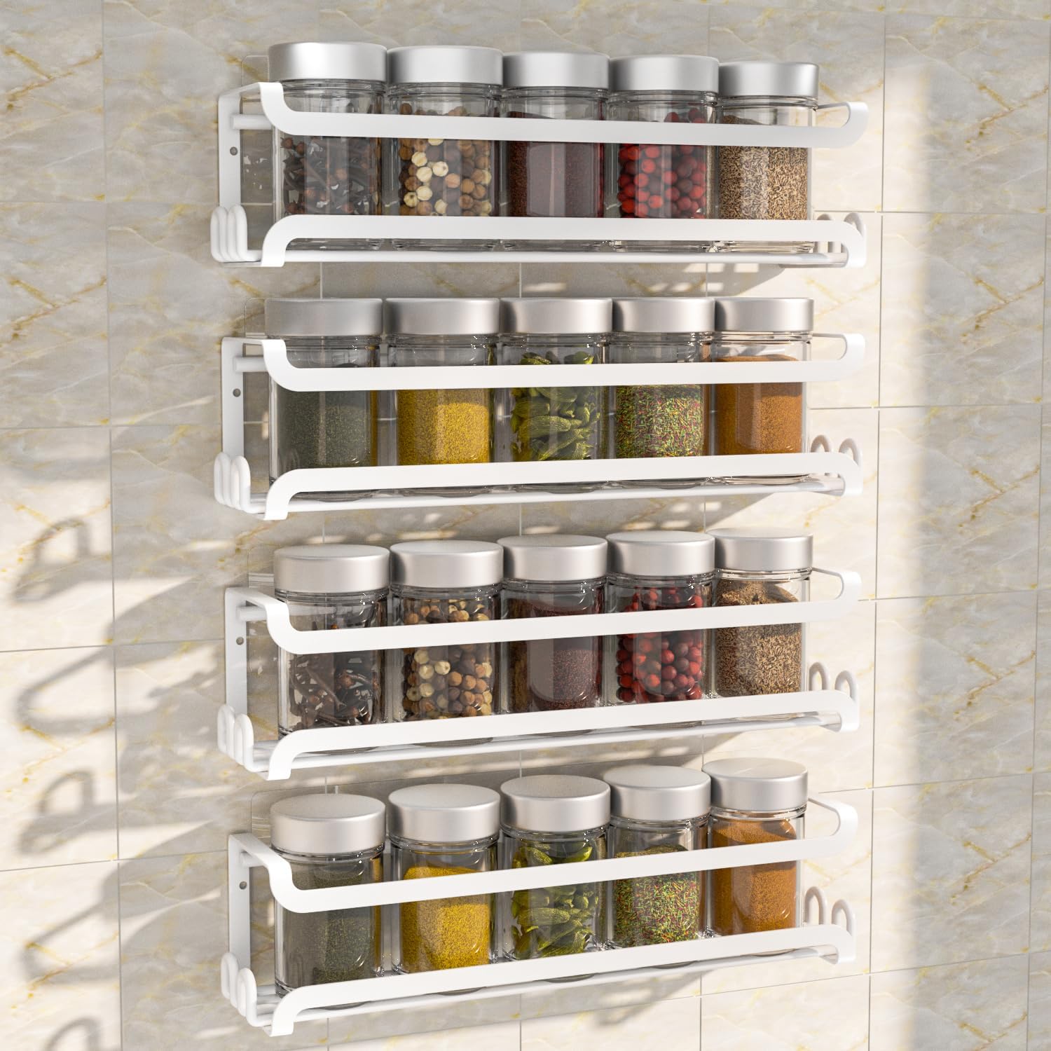 LUCYCAZ 4 Pack Wall Mounted Spice Rack with 16 Hooks, Spice Organizer Shelf for Stove Cabinet Pantry Door,Screw or Adhesive Spice Shelf Hanging Wall Spice Rack in Kitchen and RV (White, 4 PACK)