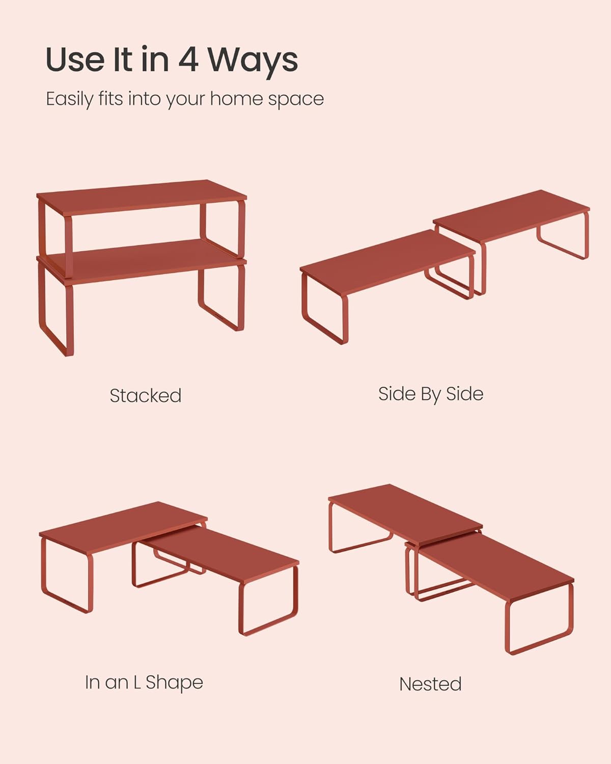 - [Adjustable] With their unique design, with one slightly smaller than the other, these shelf organizers can be stacked on top of one another, nested, used separately, or even in an L-shape. Adjust them how you want to perfectly fit your kitchen space