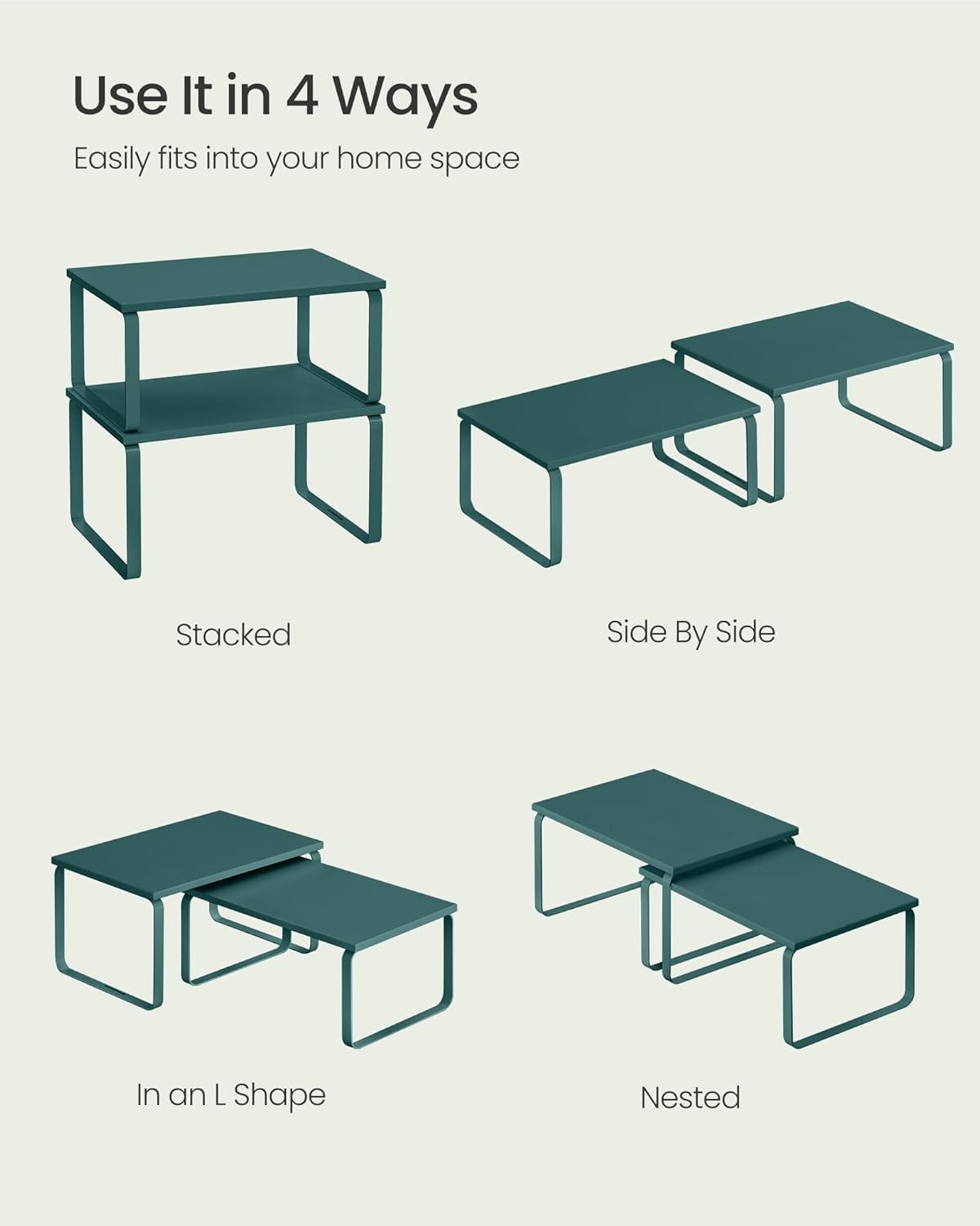 - [Adjustable] With their unique design, with one slightly smaller than the other, these shelf organizers can be stacked on top of one another, nested, used separately, or even in an L-shape. Adjust them how you want to perfectly fit your kitchen space