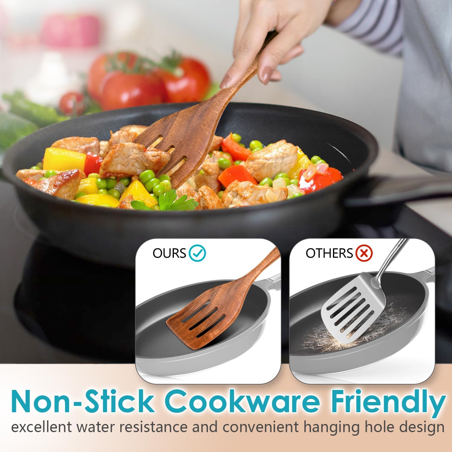 - 🌲【Nonstick Cookware Safe】These wooden utensils are perfect for use with nonstick cookware. Their smooth, natural finish will not scratch or damage your pots and pans, extending the life of your cookware. Unlike metal utensils, they are gentle on your nonstick surfaces, ensuring you can cook with confidence.