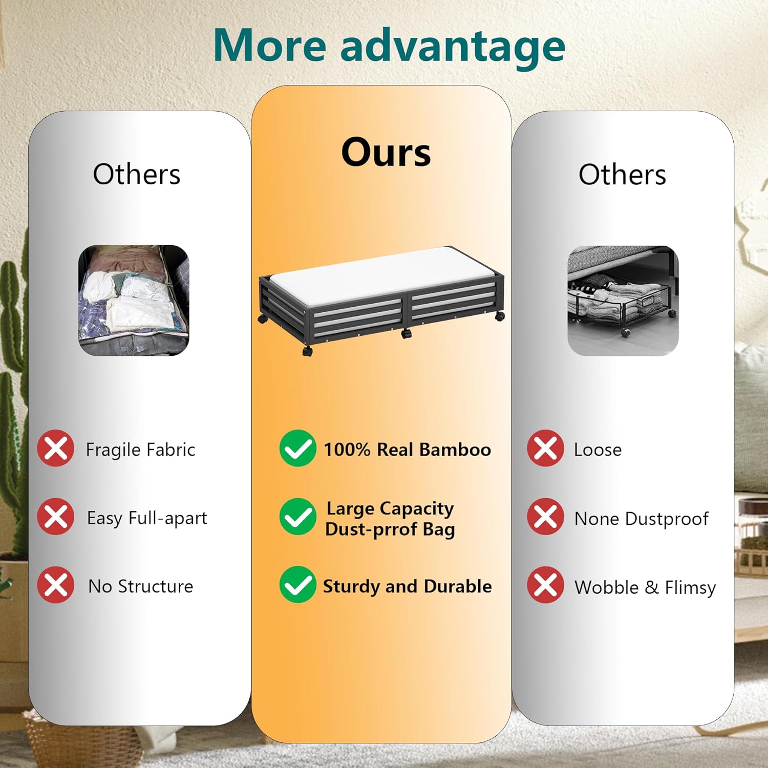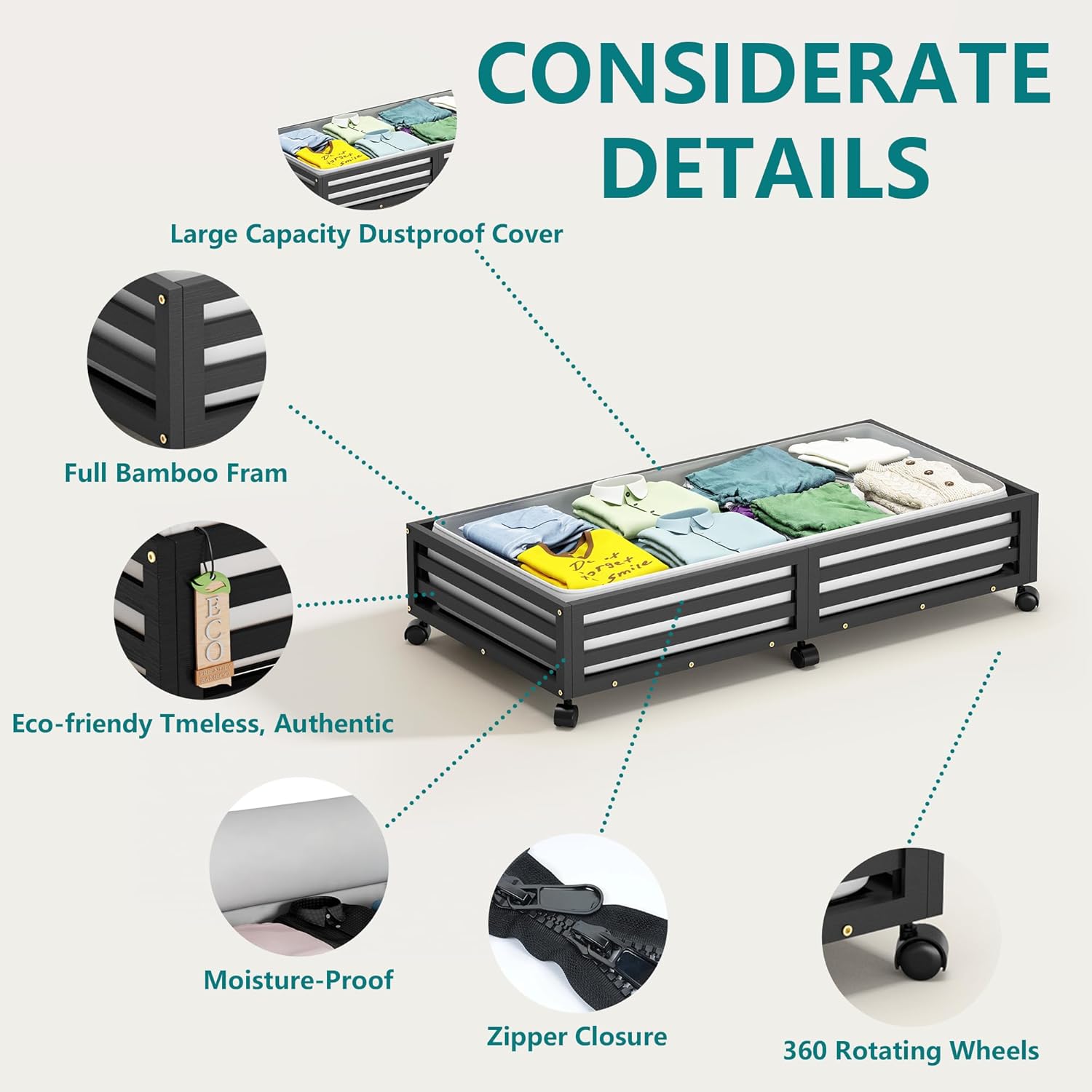 - π[Sturdy and Durable] Our under bed storage with wheels is crafted from premium wood bamboo, boasting 4 rotating wheels and a capacity of 120lbs. This 'under bed storage' solution includes non-woven bags for efficient organization of clothes, books, shoes, and toys.
