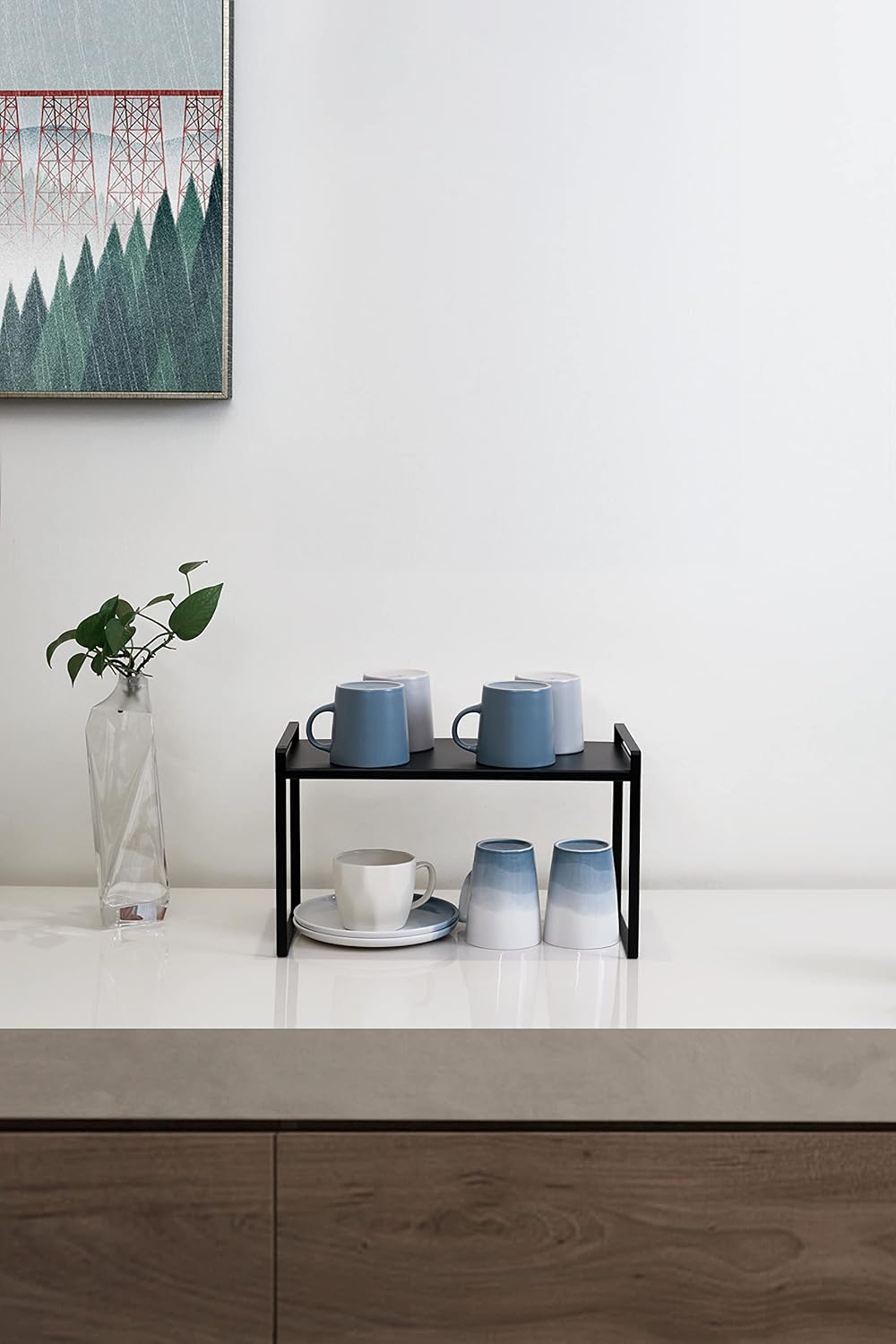 - CHARACTER DESIGN: This cabinet shelf can create plenty of space for your household items such as cups, pots, bottles, bowls, cookware, or canned foods without dominating space in your cabinet. This stylish cabinet shelf fits neatly on the countertop to keep your essentials organized and easily accessible.