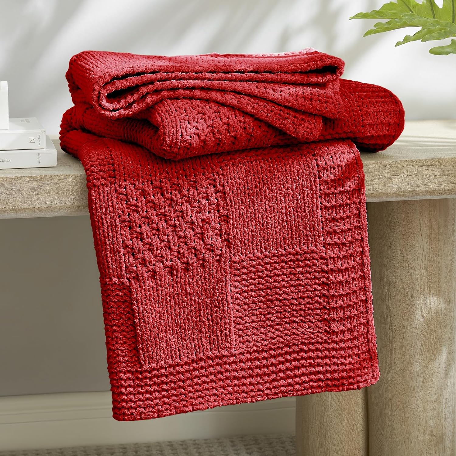 Amélie Home Chenille Knit Throw Blanket for Couch, Checkered Texture Decorative Soft Blanket for Sofa, Bed & Living Room, 50"x60", Red