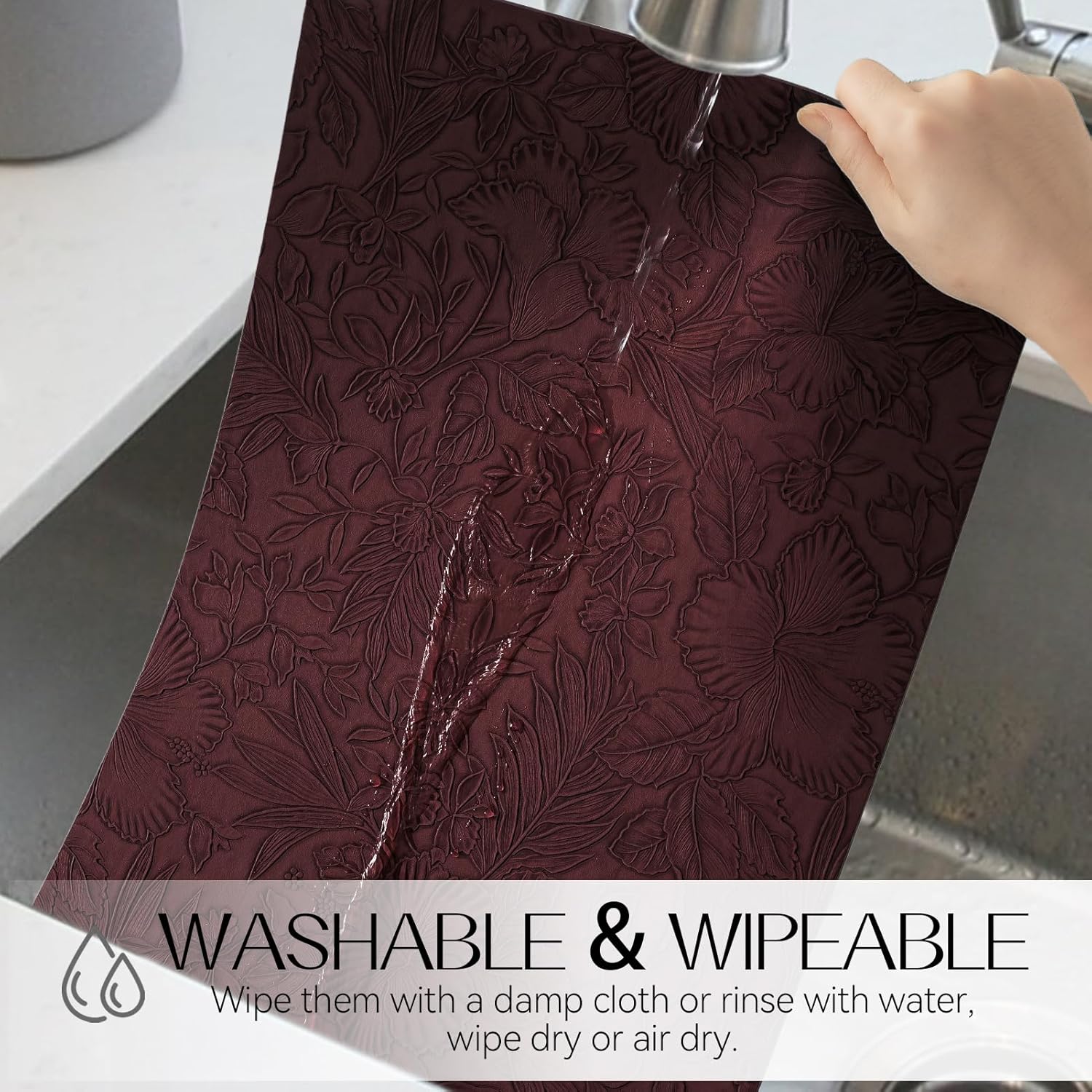 Romanstile Vinyl Placemats Set of 6-12 X 18 Inch - Heat Resistant Non-Slip Embossed Floral Place Mats 100% Waterproof Oilproof Wipeable Faux Leather Table Mats for Kitchen/Dining/Party, Burgundy